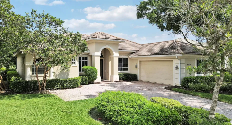 FANTASTIC VALUE IN PGA VILLAGE! Nestled on the 17th tee of the Ryder Course with a park-like setting and golf views! This 3BR+Den/2BA/2.5CG home has been lovingly enjoyed and has many charming features including built in shelving, a breakfast room, tall ceilings, dual glass entry front doors, a split bedroom plan, multiple doors leading out to the lanai, oversized garage w/ room for a golf cart and newer AC (2021). The spacious living area is brimming with light and overlooks the back yard. Kitchen opens to the breakfast room, has newer SS appliances, solid surface counters and a breakfast bar. The master suite has a large walk-in closet, access to the patio as well as an ensuite with dual vanities, walk-in shower and soaking tub. Two additional bedrooms share a hall bath.