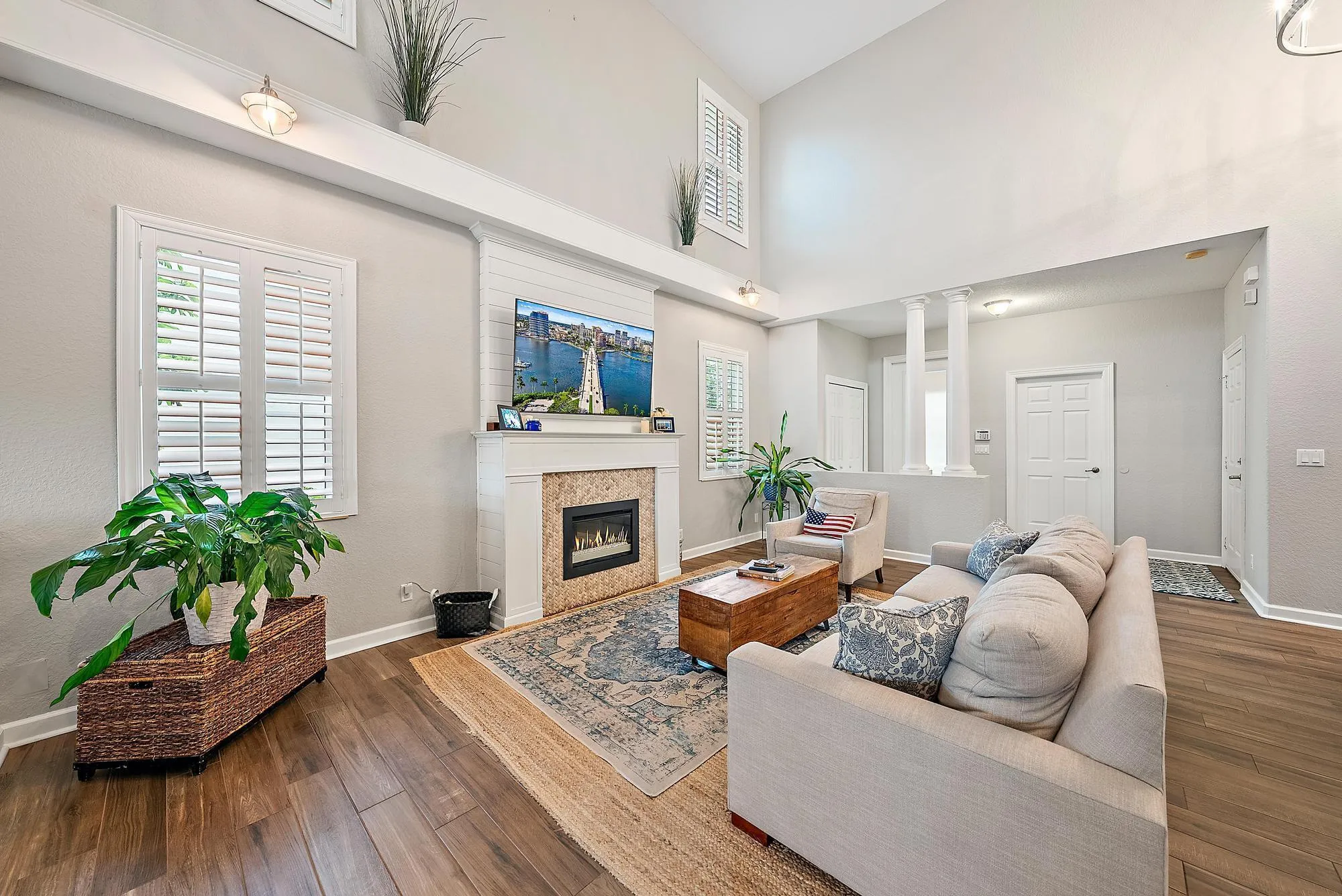 Experience LUXURY living in this stunning 4-bedroom, 3.5 bath pool home located in the sought-after Oaks of Hobe Sound. This beautifully designed lakefront residence offers the perfect combination of style, functionality, and peace of mind. Step inside to soaring 20-foot ceilings and an abundance of natural light. Features include a custom electric fireplace, wood-look porcelain tile throughout the main level, and IMPACT windows. The gourmet kitchen is complete with stainless appliances, double ovens, 42” wood cabinetry, a center cook island, granite counters, and a picturesque window overlooking the pool and lake. The first floor primary suite is a true retreat, offering direct access through sliding doors to the pool, perfect for a peaceful morning dip or evening swim under the stars.