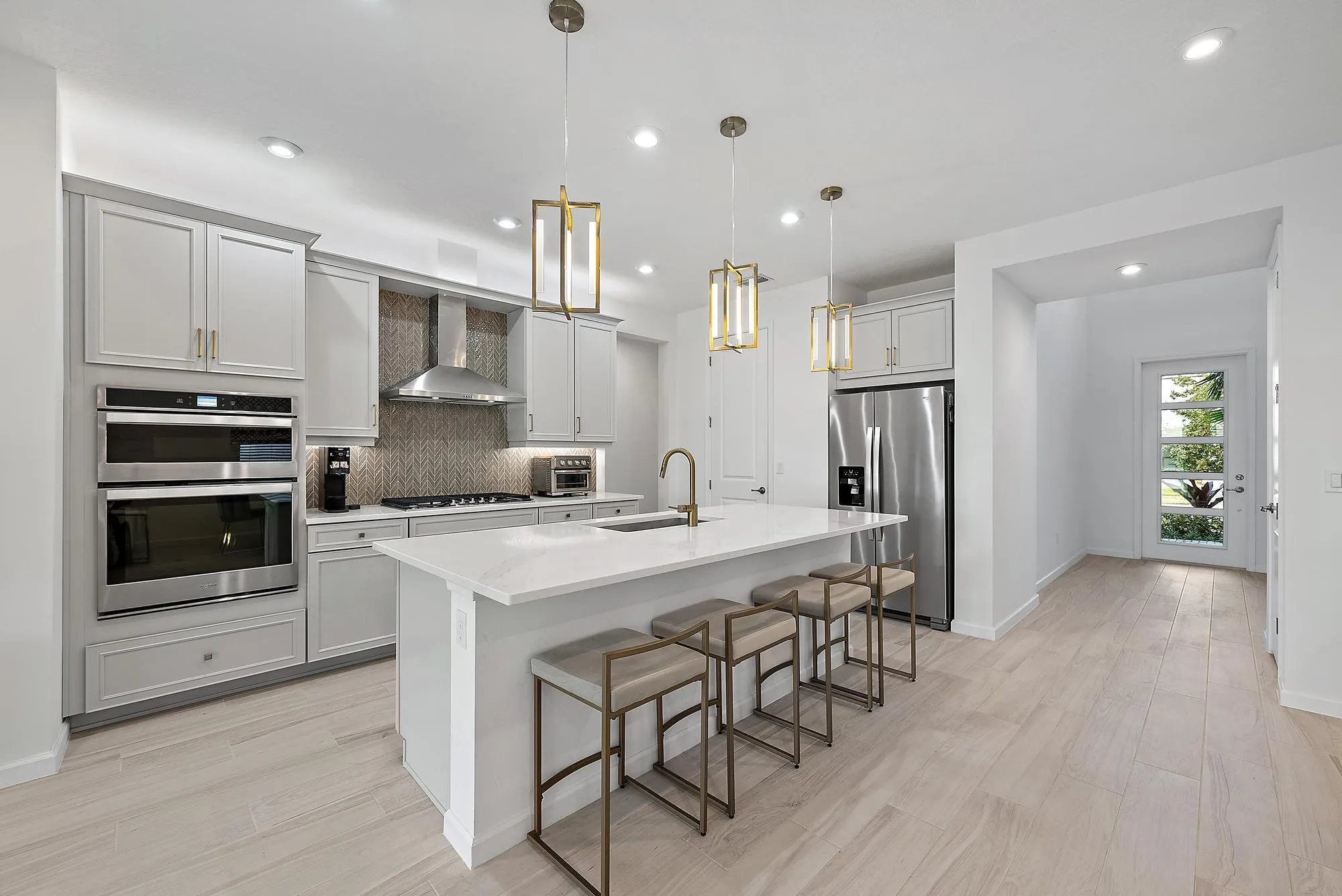 Built in 2022 and beautifully sited on a shimmering lake in Emery, this residence pairs refined finishes with everyday ease. A stone-accented contemporary elevation makes a striking first impression, while the light-filled foyer and soaring ceilings set an airy tone. The chef’s kitchen features custom cabinetry, premium countertops, and high-end appliances. The ground-floor primary suite is a serene retreat with a spa-inspired bath. Upstairs, a spacious loft and guest bedrooms offer comfortable separation and privacy. With full impact windows and doors for security and efficiency, the home blends beauty and practicality. Emery residents enjoy resort-style amenities including a pool, fitness center, and walking trails.