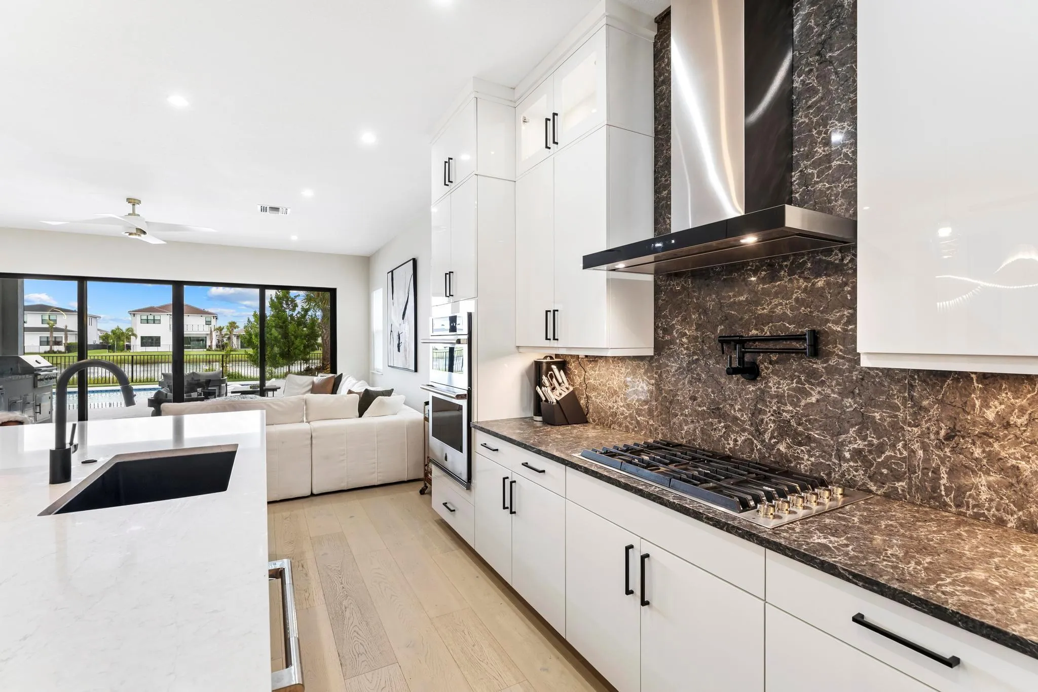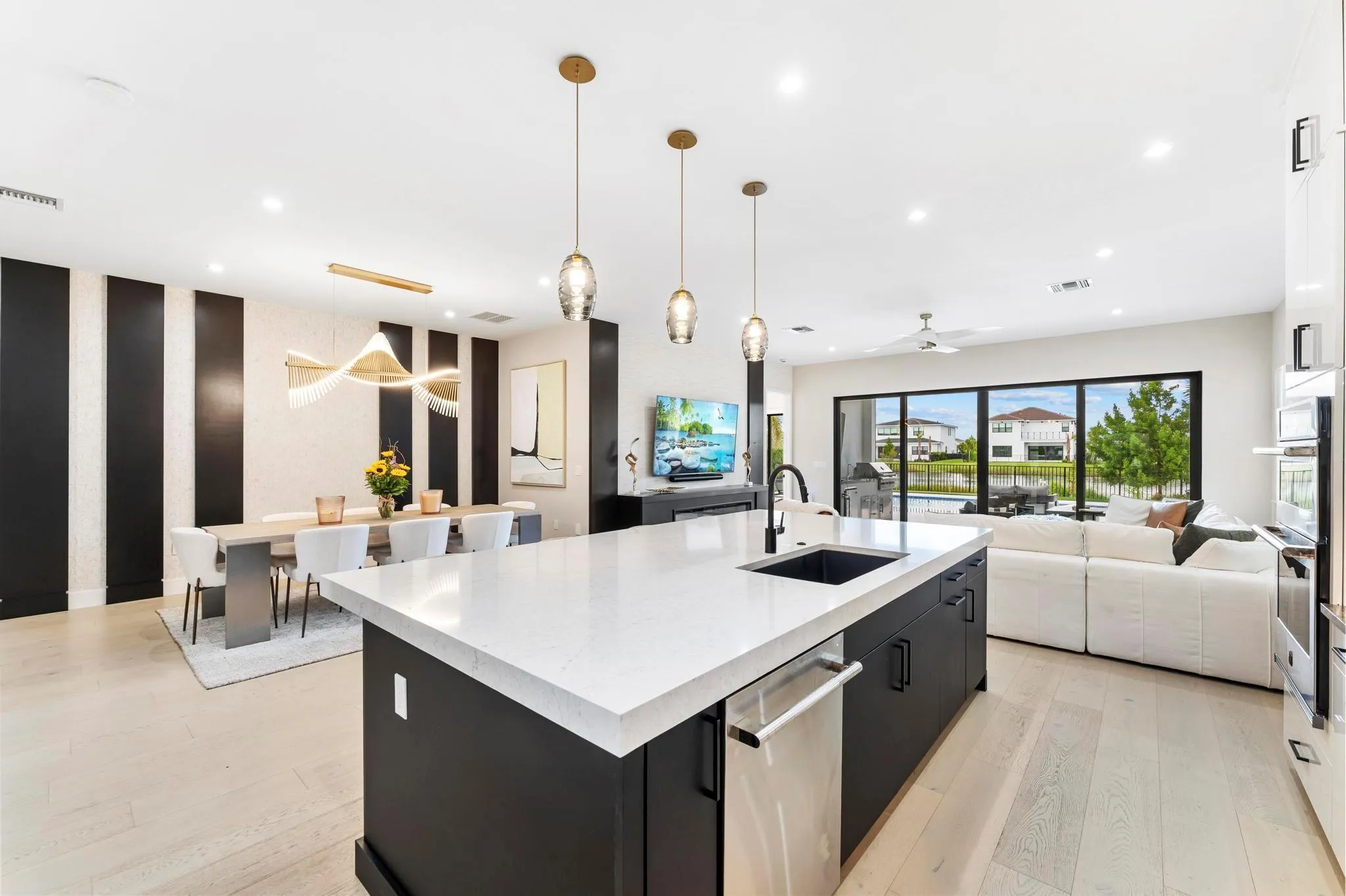 One-of-a-kind – a 2024 build, highly upgraded, designer finished pool home with 5 beds, 6 baths, office, media room and loft! Available fully furnished. The premier lot offers lake views, custom pool, outdoor kitchen, retractable screens, & a putting green. Over $500k in builder and designer upgrades, including custom lighting & fans, artwork, electric shades, upgraded baths, epoxy garage floor, upgraded cabinetry, central vac, and EV charging station. Elegant first floor primary suite includes two incredible walk-in closets, finished to perfection, and sliding impact doors leading directly to the heated saltwater pool & spa. North-facing backyard provides the best exposure for all-day sun, while the custom home theatre with projector & surround sound creates the perfect in-home escape.