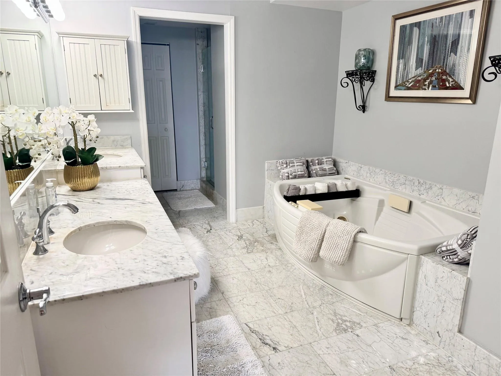 SE EXPOSURE. ALL DAY SUN. 2 Terraces. Private elevator. Marble floors. 3rd bedroom has Murphy style wall bed and built in desk /wall system . EASY TO SEE. Resort-style complex with 2 clay tennis courts, POOLSIDE RESTAURANT, 2 pools, 2 spas, SELF PARKING IN GARAGE plus valet for guests, private beach pavilion with tikis, cabanas, BBQ and beach attendant. 2 PETS,ANY SIZE, OK. L’Hermitage is well funded, great reserves, many completed and funded improvements , such as surface work repair and painting, new lap pool, new roof, funded elevator project . NOTE THAT APPROX. $300 per qtr is a credit to spend in the poolside restaurant . Full bar with happy hour, dine alfresco or delivery.