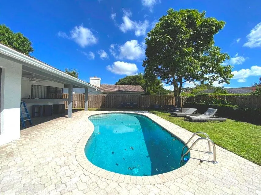 SIMPLE FAST RENTAL! Spacious, beautiful 4 bedroom, 2.5 bathroom home with a private gorgeous pool area, ideally located off Jog Road, just north of Glades Road. This residence features nice light laminated flooring, granite countertops, custom wood cabinetry, a cozy fireplace, and a spacious two car garage. The bedrooms are very bright due to the natural light. This home sits on a large, beautifully maintained lot perfect for relaxation and entertaining. Call now.