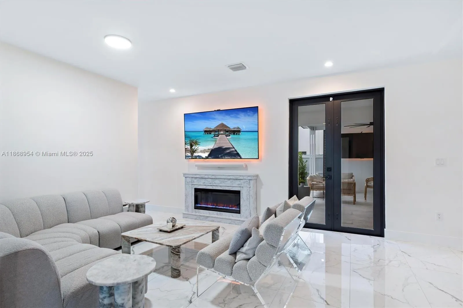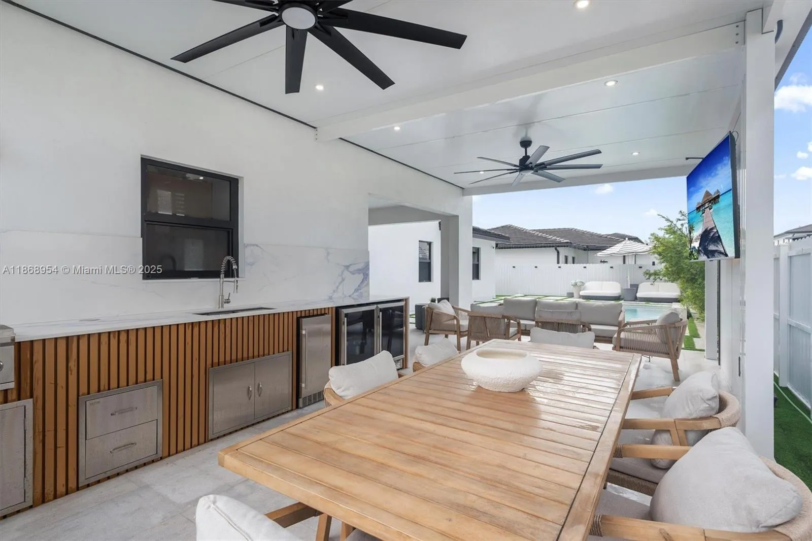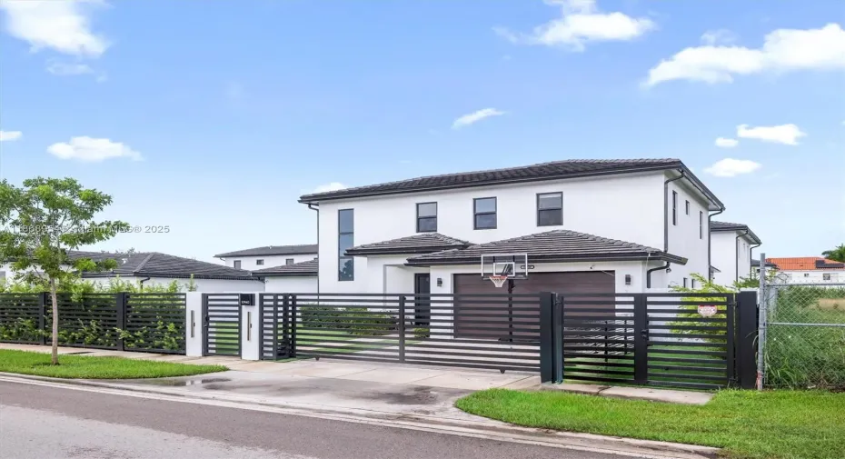 Built in 2023, this Breccia model blends modern design with everyday comfort. The open layout showcases a chef’s kitchen with quartz countertops, stainless steel appliances, sleek cabinetry, and a spacious island overlooking sunlit living areas. Impact windows and doors provide security, efficiency, and style. Outdoors, enjoy a saltwater heated pool, covered patio, and summer kitchen with 2 beverage coolers, ice maker, BBQ, flat top grille, and burner—perfect for entertaining. The grounds feature professional landscaping, artificial turf throughout, irrigation system, perimeter lighting, and a privacy fence with lush foliage. Additional highlights include a fenced pet area, porcelain floors, LED lighting, concrete tile roof, and 2-car garage with ample parking.