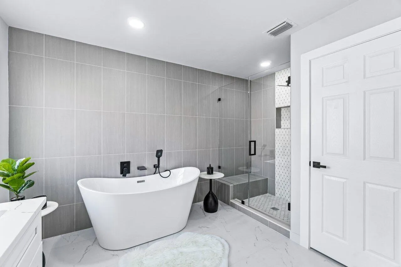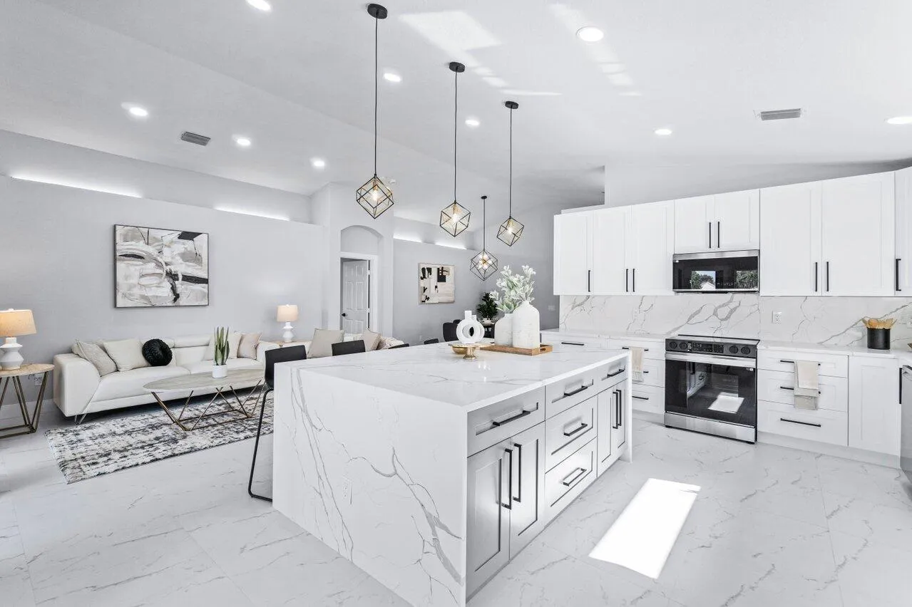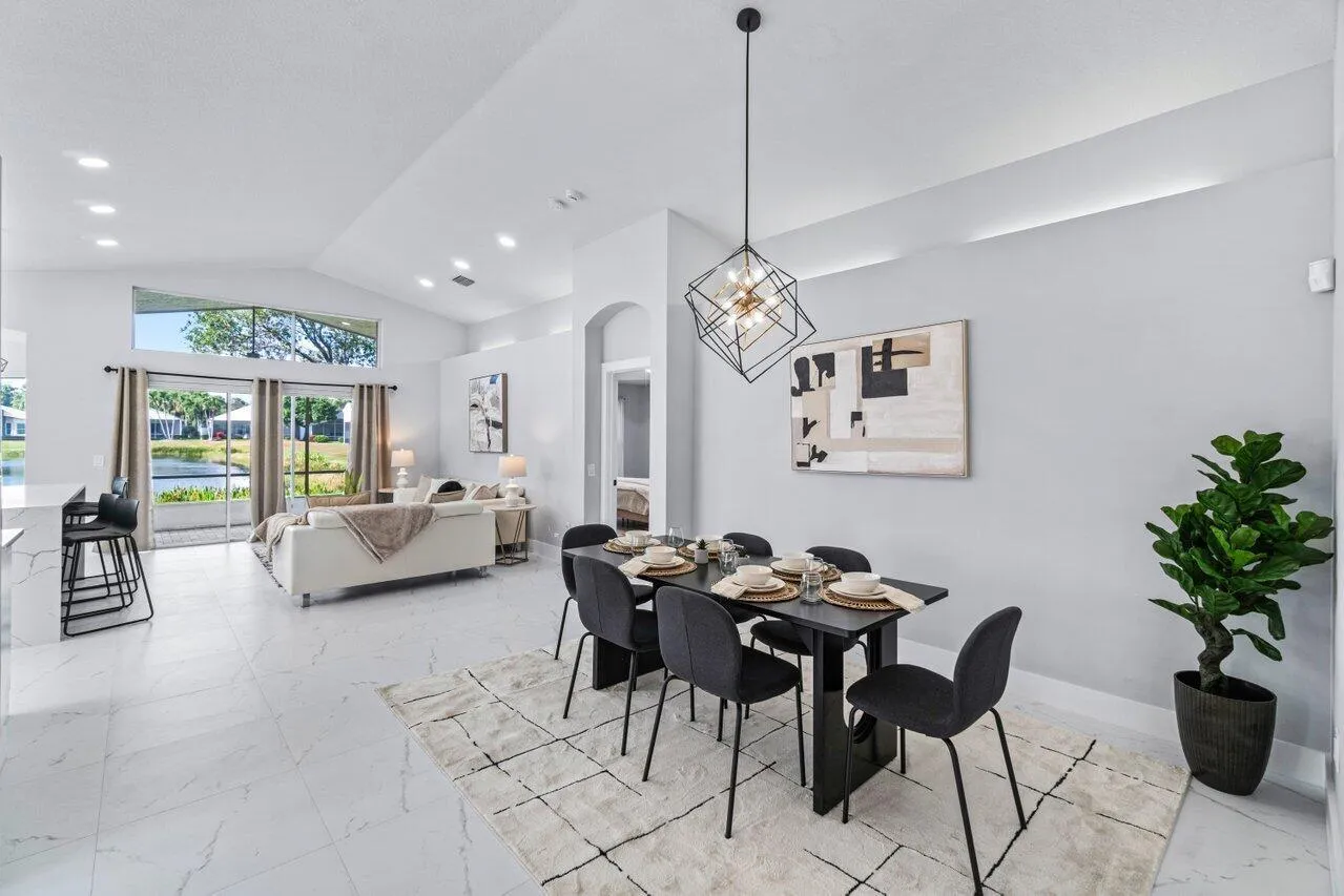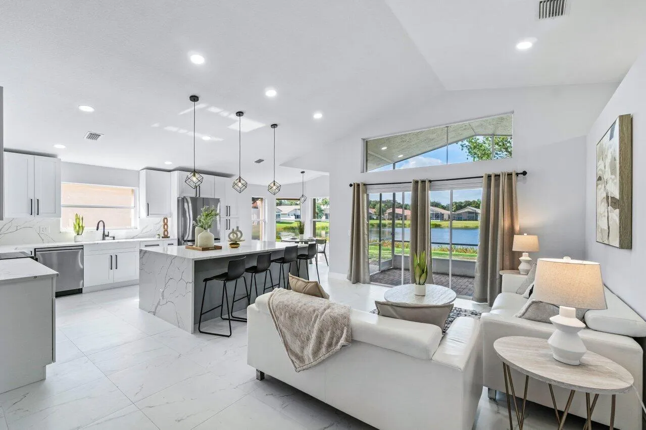 Welcome to your dream home in the picturesque Valencia Lakes! This BEAUTIFULLY RENOVATED 3-bedroom, 2-bathroom residence offers unparalleled lake views, arguable the best in the community. NEW 2025 AC. Step inside to an open floor plan adorned with exquisite marble-style porcelain flooring that seamlessly flows throughout all living spaces. Chef’s kitchen, featuring brand new Samsung stainless steel appliances, kitchen island, ample storage, and sleek recessed & pendant lighting. It’s the perfect space for culinary creations and entertaining guests. Retreat to the luxurious primary suite, where relaxation awaits. Indulge in the separate soaking tub or the walk-in shower, complemented by his and hers vanities, offering both convenience and elegance.