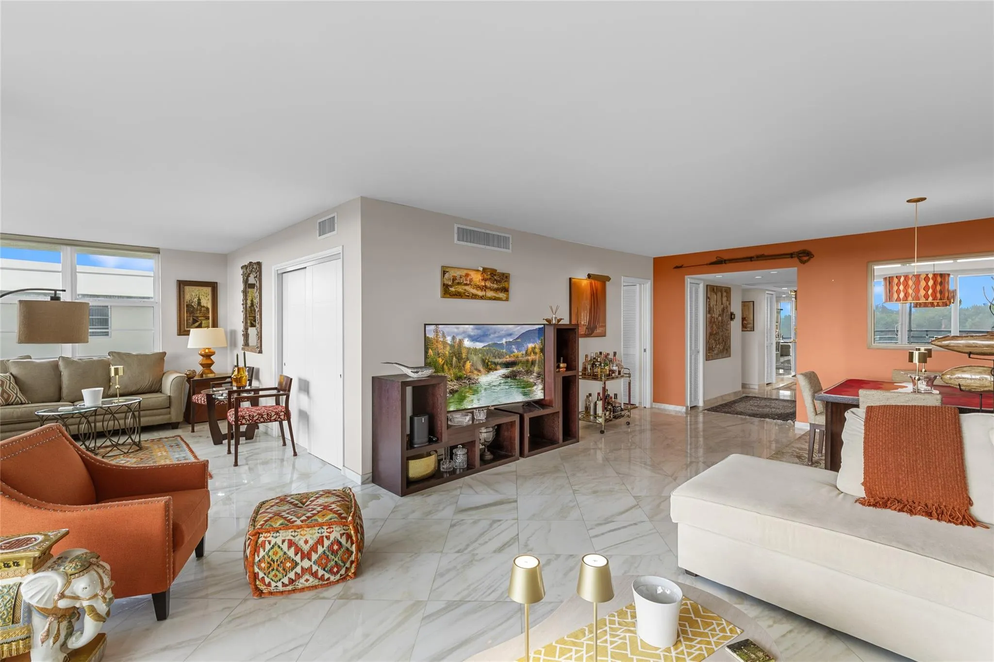 Stunning, move-in-ready Penthouse with MARBLE floors, IMPACT windows, & top-tier finishes. Fully updated corner unit available @ $2500/month furnished or unfurnished (owner will remove artwork/personal items). Features stainless steel appliances, double oven, updated thermostat, and remote-controlled blinds in most rooms. Third bedroom used as den/office/flex space. Spacious primary suite; both bathrooms have windows. Full size washer and dryer in the unit. Elegant foyer entry. Amenities include pickleball, tennis, and playground at George Brummer Park; secure lobby, and mailbox; 3 pool areas with grills. Rent includes INTERNET, Cable, water, trash, sewer, and THE best parking spot in the building. Condo requires 720+ credit score. Landlord requires tenant to maintain renter’s insurance.