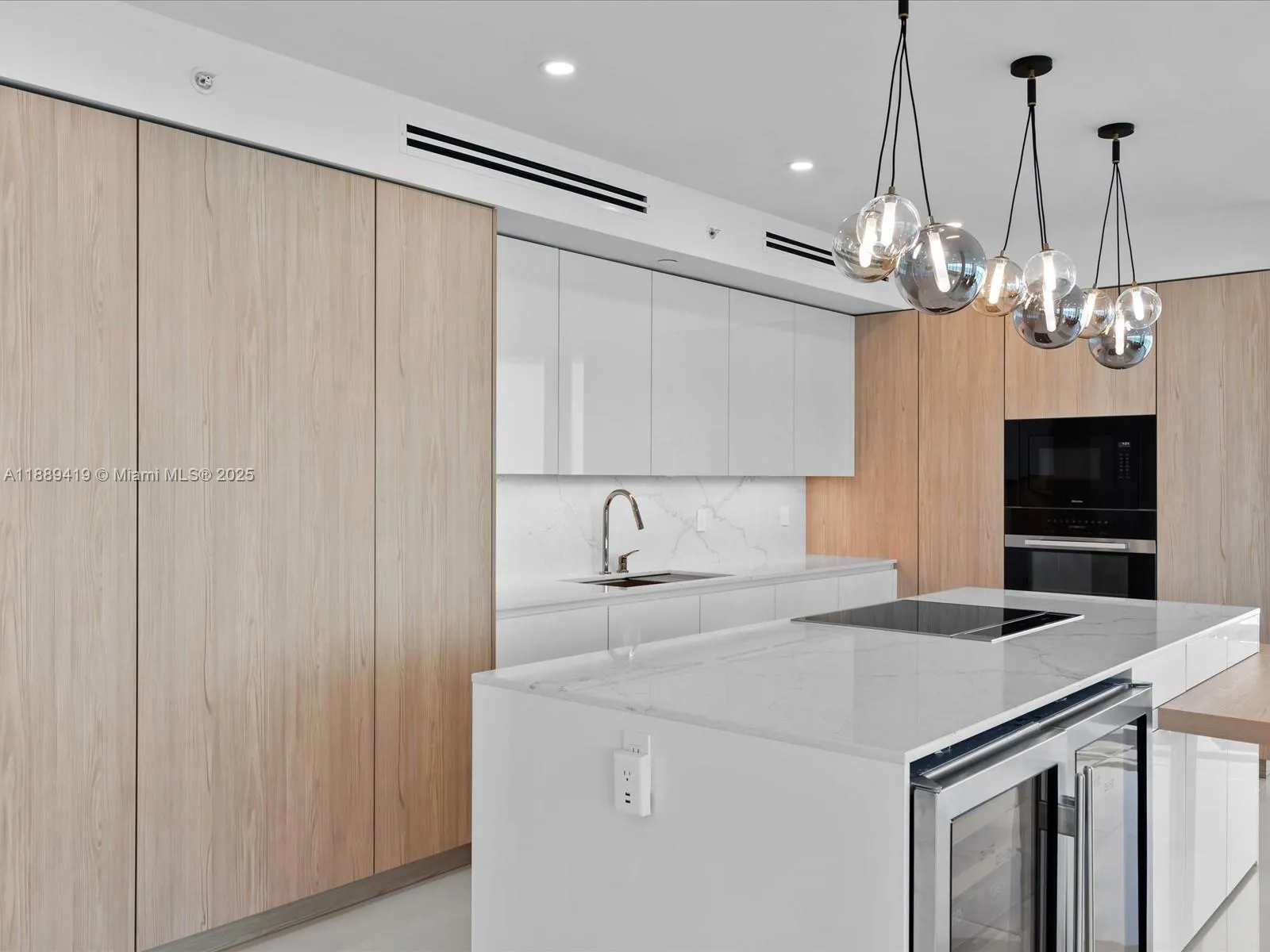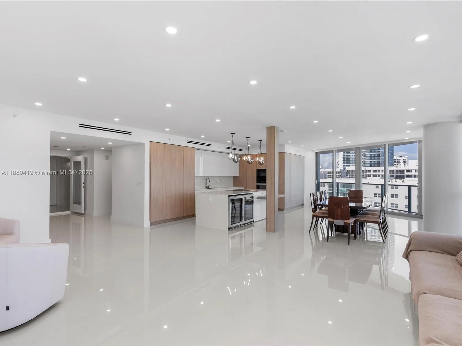 Completely remodeled direct oceanfront residence at Ocean Palms. 3 bedrooms plus den (convertible to office/4th bedroom), 4.5 baths, 3,091 sq. ft. interior + 513 sq. ft. balconies. Beautiful Italian slab tile floors throughout, custom bathrooms with European fixtures, master bath with double vanity, tub, glass shower, and walk-in closets in all bedrooms. Leicht German kitchen with custom cabinetry, quartz counters, Miele appliances incl. induction cooktop and retractable downdraft vent. Two new AC units. Three balconies with ocean, city & Intracoastal views. Amenities: resort-style pool, 2-story fitness center, spa, party & billiard rooms, movie theater, tennis court, BBQ area, 24/7 security, valet. Apartment includes 2 garage spaces & storage.