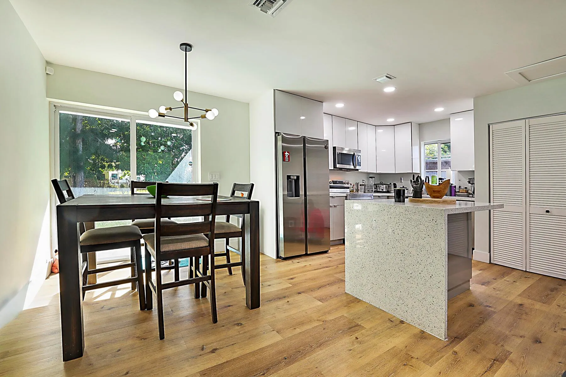 Beautifully remodeled 3-bed, 2-bath home offering the perfect blend of modern design & everyday comfort! Step inside to an open-concept floor plan filled with natural light, highlighting the sleek finishes throughout. The contemporary kitchen features quartz countertops, top-of-the-line stainless-steel Samsung appliances, a touchless faucet, and an oversized modern farm sink — ideal for cooking & entertaining.Both bathrooms are tastefully updated with water-efficient fixtures and elegant porcelain tile. The home is energy-efficient, equipped with LED lighting, a tankless water heater & a brand-new Samsung washer and dryer set.