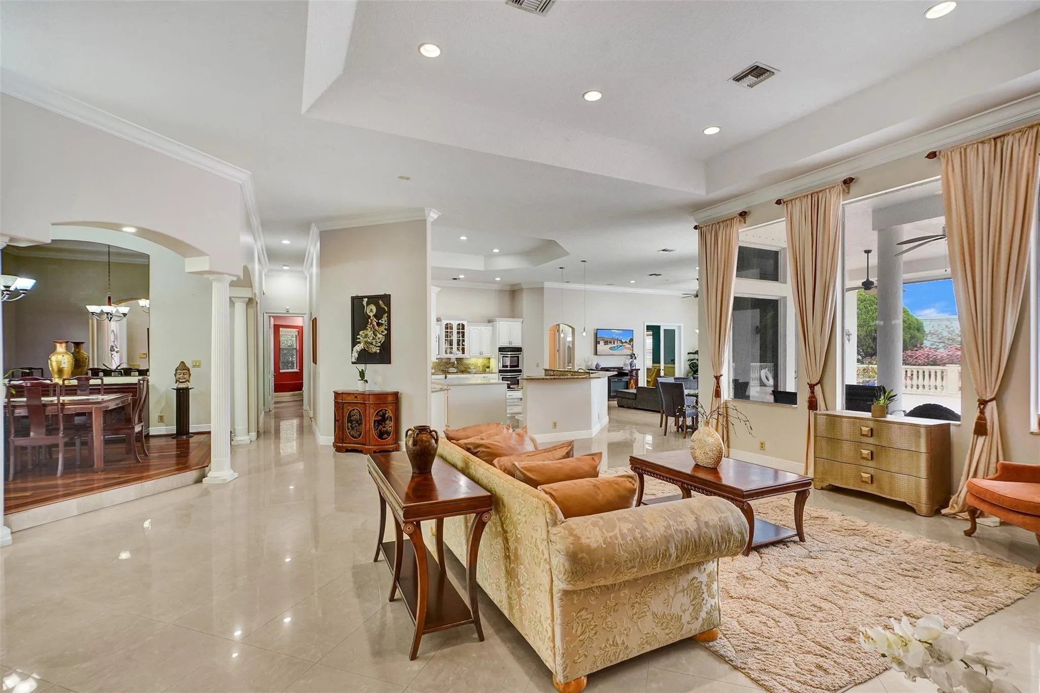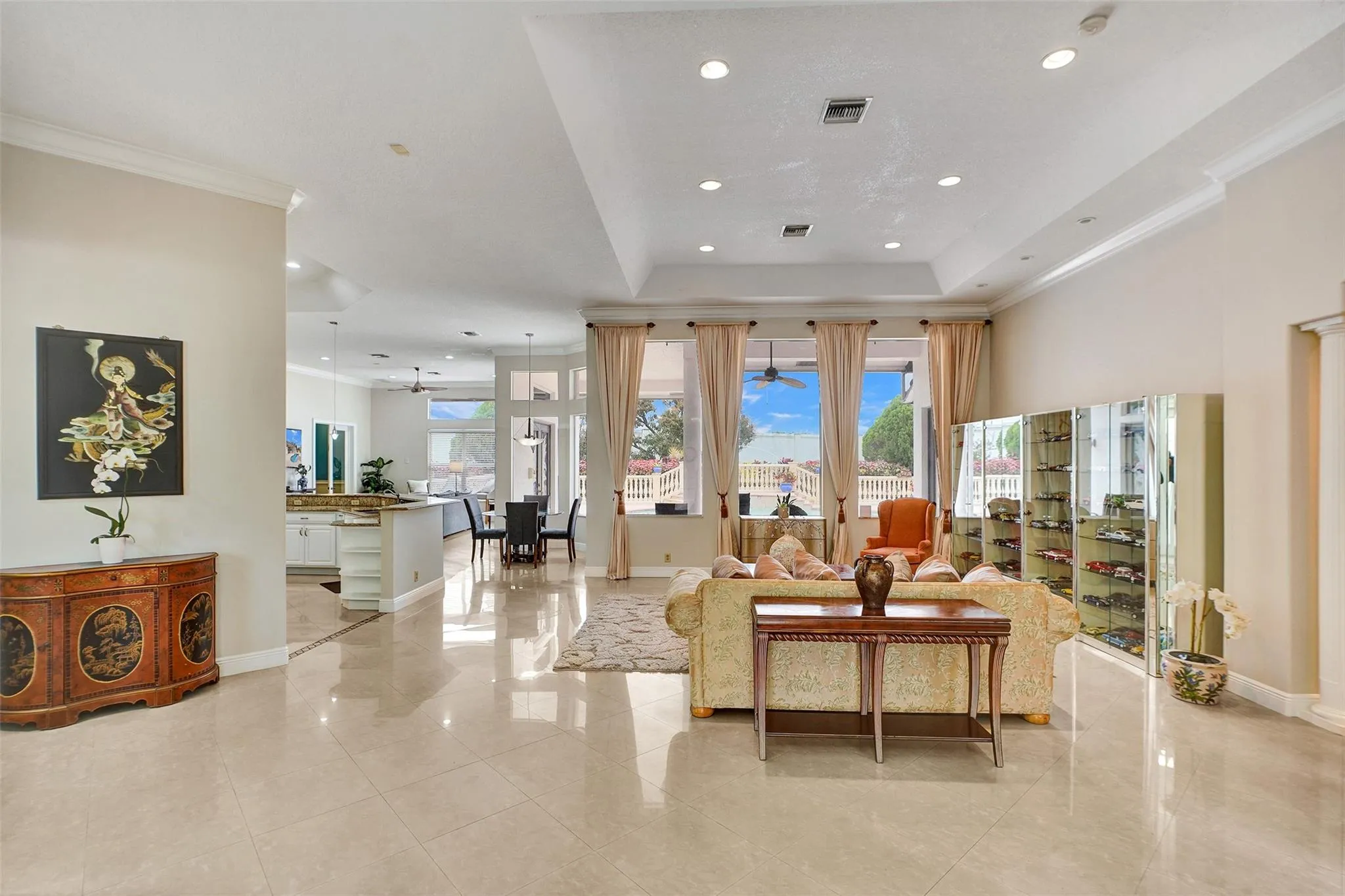 Experience unparalleled grandeur in this estate on over an acre in the prestigious Delray Lake Estates. Boasting 5 bedrooms, 4.5 baths, and an open-concept split floor plan, this home features soaring 12-foot ceilings, crown molding, and elegant tray ceilings. The master suite offers patio access, a Jacuzzi tub, walk-in shower, and bidet, while all bedrooms include custom closets, with two showcasing bay windows. The chef’s kitchen shines with a large island, new appliances, and a breakfast nook overlooking the pool and patio. Additional luxuries include a media room, home theater, library, and custom office/study. Outside, enjoy a tropical oasis with exotic fruit trees. Located near the turnpike for convenience, this estate is a rare blend of luxury and privacy. Same Day showings!