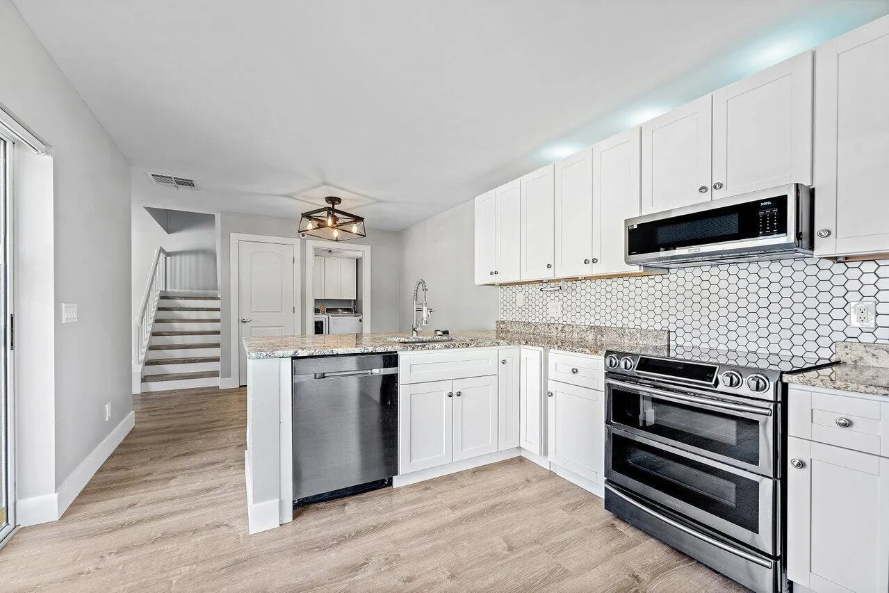 A charming renovated 2-bedroom townhome nestled in the sought-after gated community of Wellesley at Lake Clarke Shores. Bright, airy, and move-in ready, this home impresses with modern finishes and a dual-master layout perfect for privacy and comfort. Step inside to a spacious living area with flat ceilings, new flooring, and an abundance of natural light. The updated kitchen features crisp white cabinetry, stainless steel appliances, a double-door oven, welcoming bar, and a white glass French door refrigerator that complements the clean, modern aesthetic.Upstairs, both bedrooms offer on-suite baths, walk-in closets with built-in storage, creating two true master suites. Additional highlights include accordion shutters, modern fixtures, and thoughtful design details throughout.