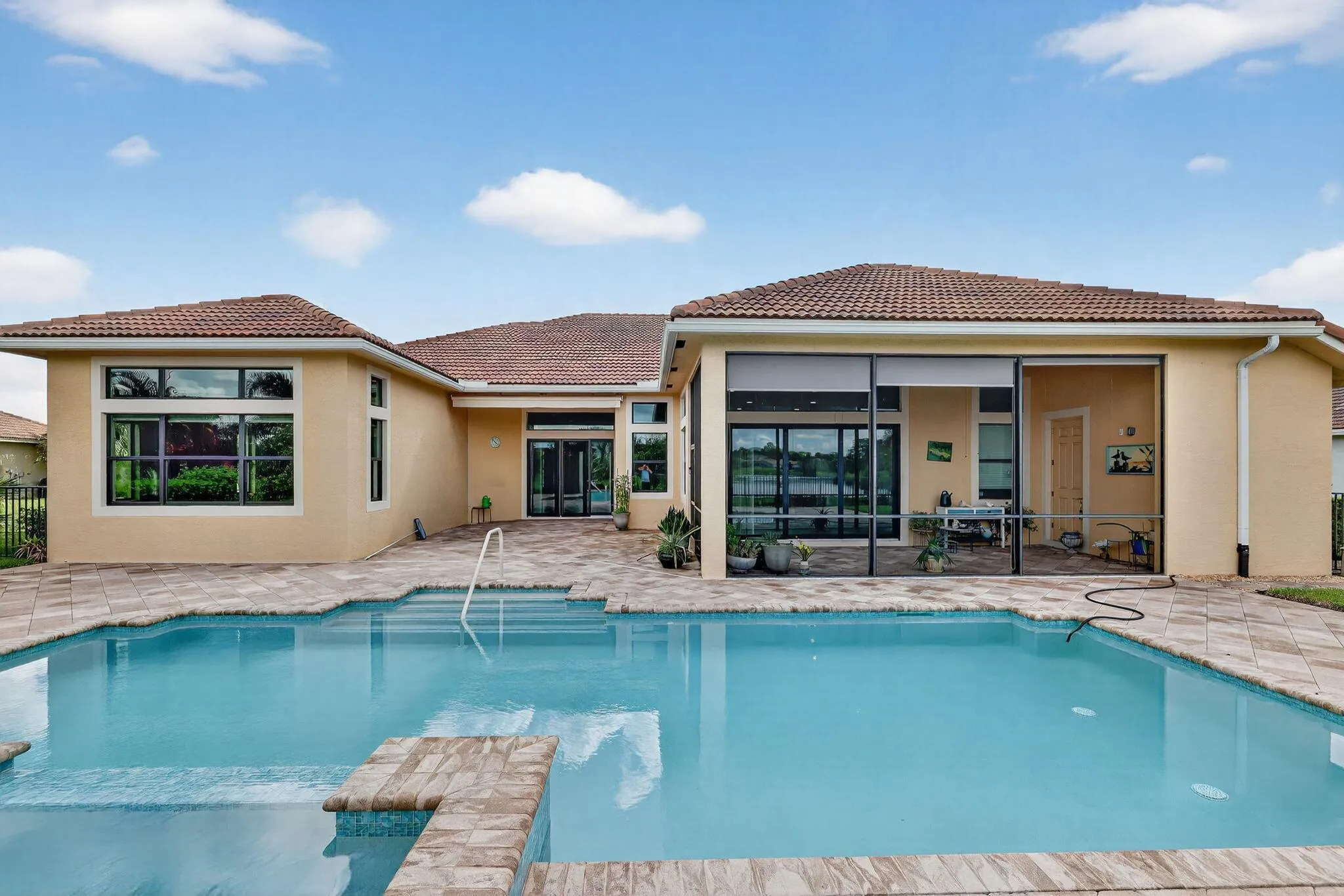 Elegant 4-bedroom, 4.1-bathroom home with an office, located at 2960 SW English Garden Dr in the prestigious Canopy Creek community by Kolter Group Builders. This single-story residence boasts a prime lot overlooking a spacious pool & tranquil lake-perfect for relaxing and entertaining. Designed w/ updates & upgrades, this home features a modern HVAC system with UV light, a whole-house generator, a water softener system. The screened porch provides a serene outdoor retreat, ideal for enjoying morning coffee or evening sunsets while taking in the breathtaking lake views. Recently added an awning extends shaded outdoor living, enhancing the space’s comfort & usability. The primary bathroom includes a luxurious walk-in bathtub for easy showers.