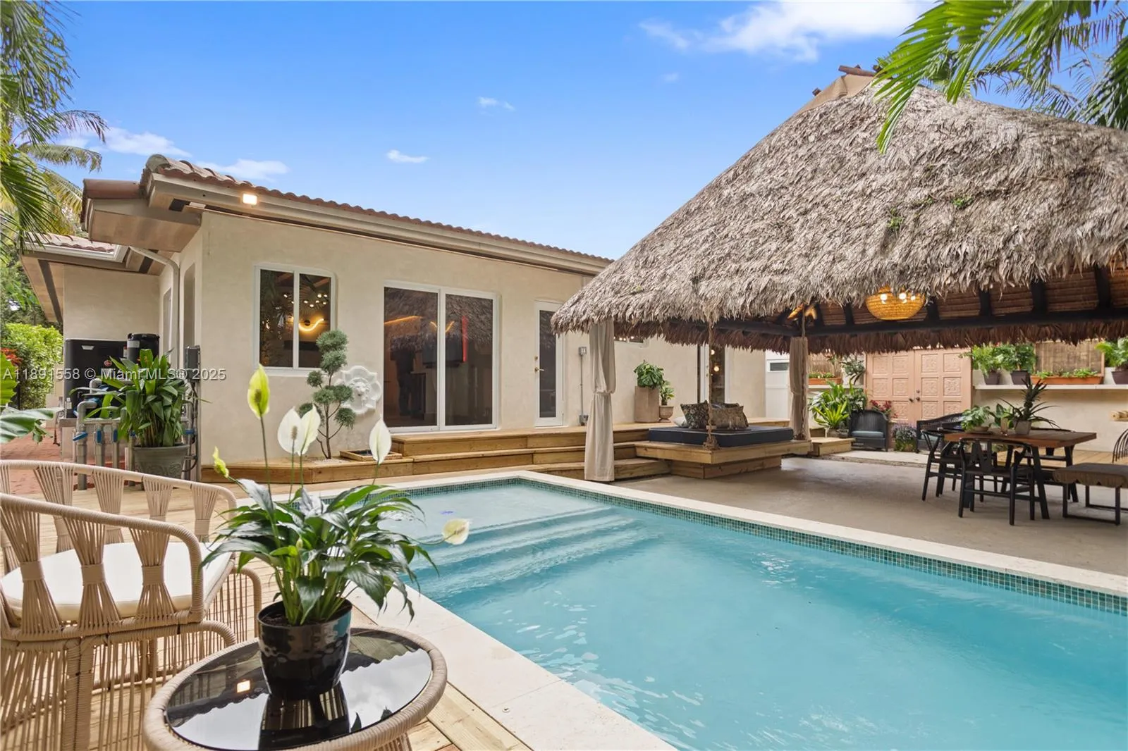 Escape the fast pace of Miami in this Bali-inspired tropical retreat located in Shorecrest, just minutes from Miami Shores and North Bayshore Park. Featuring a new pool with deck, in-ground jacuzzi, outdoor cold plunge & soaking tub under the palms, Tiki lounge area, and zoning for short-term rentals. This fully renovated 3-bed, 3-bath home features one suite with a private entrance and bathroom, plus a spacious den that can easily be converted into another bedroom. The property has all-new plumbing, electrical, ceilings, and walls, as well as impact doors and windows — all with closed permits. Enjoy low Miami-Dade taxes, serene outdoor spaces, and the perfect blend of design, comfort, and investment potential. Furniture and decoration shown in photos available separately.