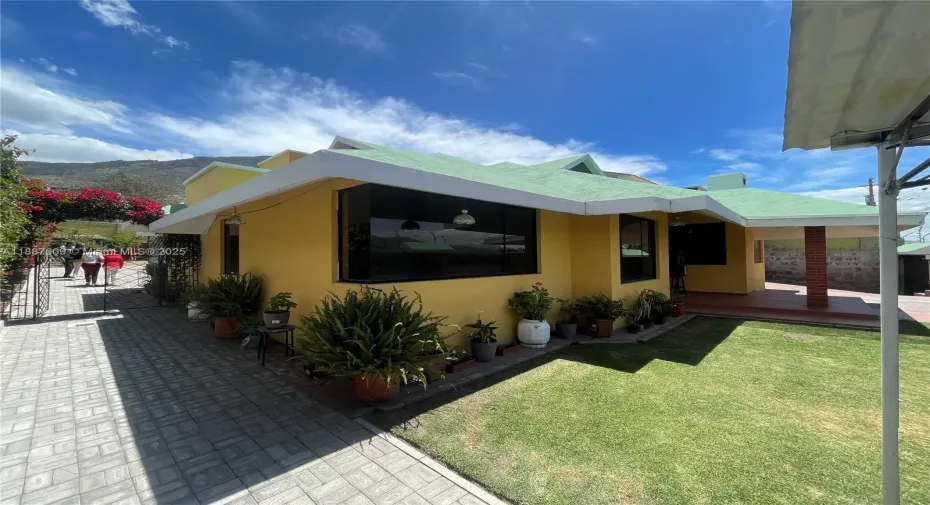 Beautiful 5-bedroom home in Pomasqui, Ecuador, north of Quito and near the Middle of the World Monument. Main level with 3 full baths, half bath, spacious living room, dining area, and large kitchen with breakfast counter. Parquet wood floors add warmth and style. Upstairs offers a private suite with bath, gym, and terrace with mountain views. Concrete roof with stone finishes, covered parking for one car plus two uncovered spaces. Large backyard ideal for a pool or soccer field, surrounded by fruit trees, plus a multipurpose room for games or music. Strategically located near Manuel Córdova Galarza Highway, Supermaxi, Plaza Pomasqui, Pululahua Reserve, and Rumicucho Ruins.