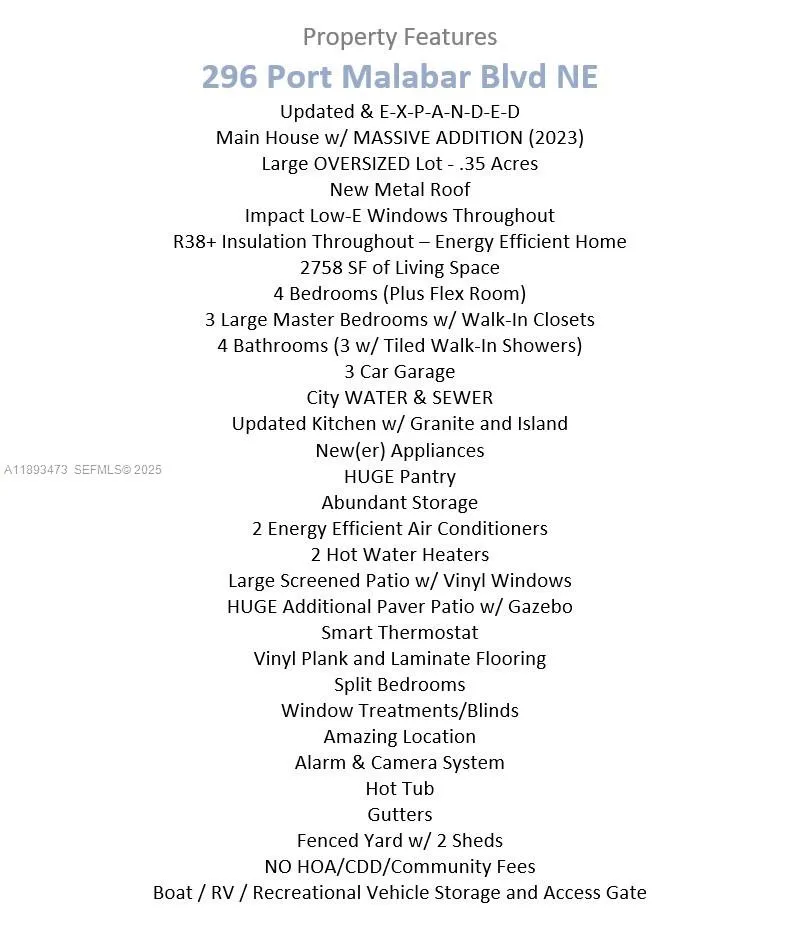 Updated & EXPANDED! Main House w/ MASSIVE ADDITION (2023)! Large OVERSIZED Lot .35 Acres! New Metal Roof! Impact Low-E Windows Throughout! R38+ Insulation – Energy Efficient! 2758 SF of Living Space! 4 Bedrooms (Plus Flex Room)! 3 Master Bedrooms w/ Walk-in Closets! 4 Bathrooms! 3 Car Garage! City WATER & SEWER! Updated Kitchen w/ Granite and Island! New(er) Appliances! HUGE Pantry! Abundant Storage! 2 Energy Efficient Air Conditioners! 2 Water Heaters! Large Screened Patio w/ Vinyl Windows! HUGE Additional Paver Patio w/ Gazebo! Boat / RV / Recreational Vehicle Storage and Access Gate! Vinyl Plank and Laminate Flooring! Split Bedrooms! Window Treatments/Blinds! Alarm & Camera System! Hot Tub! Gutters! 2 Large Sheds! NO HOA/CDD/Community Fees!