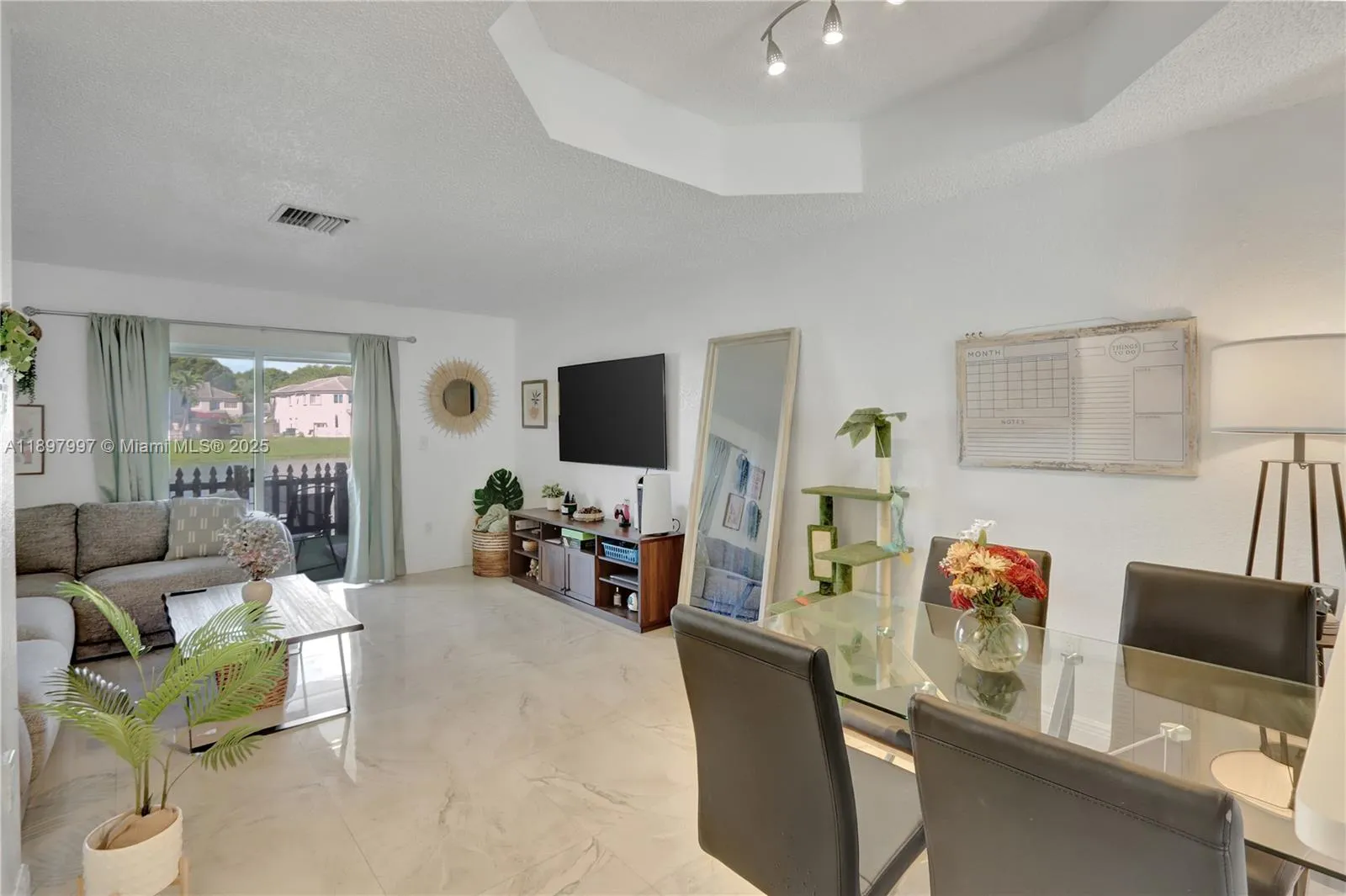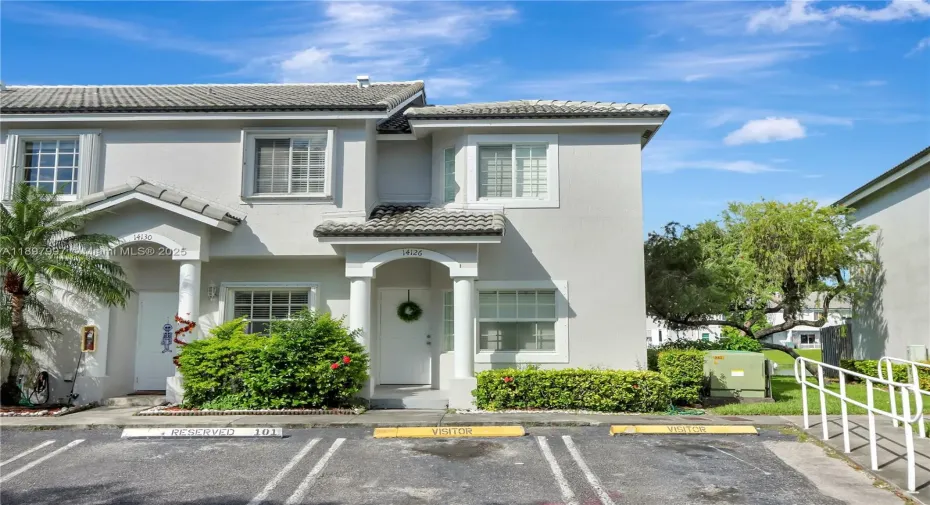 This waterfront townhome, offers 2 bedrooms and 2 bathrooms—one full bath and one half bath. 950 Sq. ft home features ceramic tile flooring throughout and includes essential appliances such as a dishwasher, microwave, refrigerator, and washer. The property is equipped with central air, impact windows, a new roof, a new AC unit, and a Titan water heater, providing energy-efficient hot water on demand.Built in 1996 with durable CBS construction, this newly constructed townhouse-style condominium offers the convenience of a first-floor entry, a private patio, and a scenic view of the lake. Community amenities include a pool. One open parking space with additional uncovered parking available. Security is well-covered with features such as complex fencing, card entry, and a security guard.