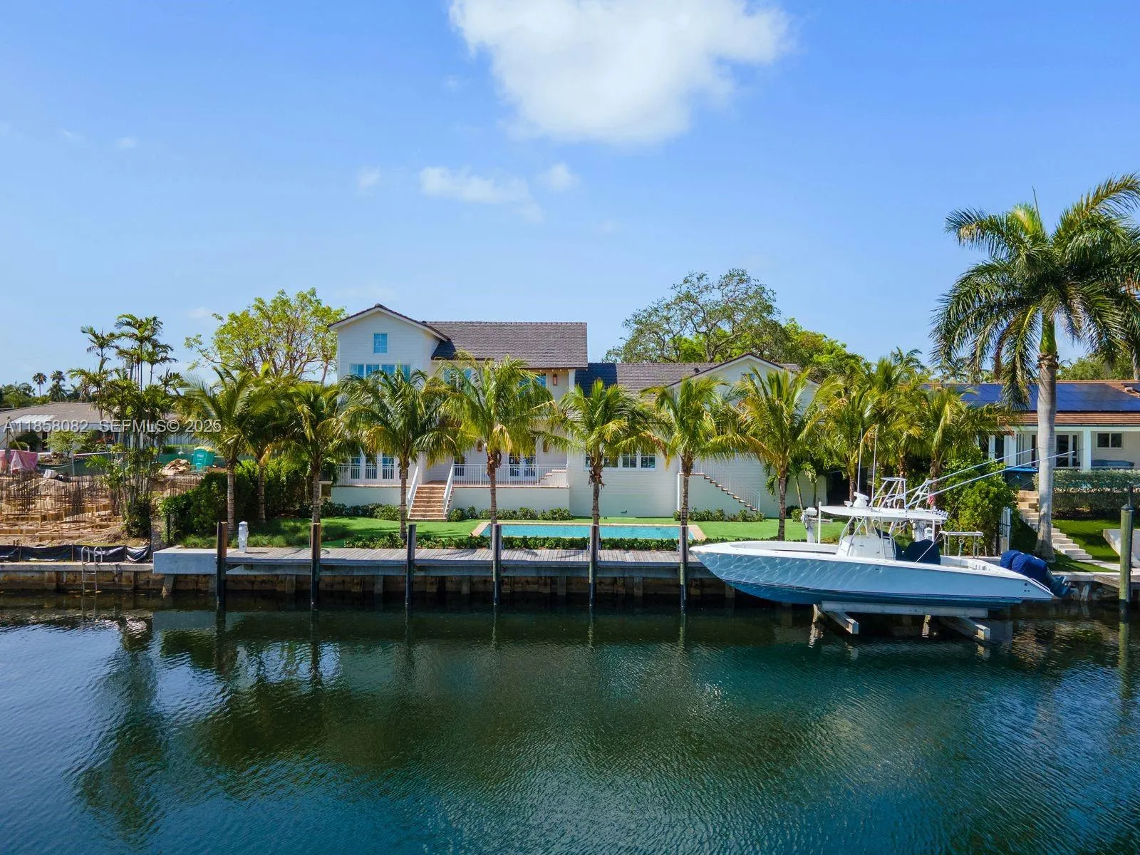 A Yachtsman’s dream home totally new 2025 rebuild sits high on a 12,000 SF direct ocean access lushly landscaped tree-shaded interior lot on a quiet cul de sac street in the highly regarded Gables by the Sea guard-gated community. This New England style 2-story 5 bdrm 4.5 bth home is filled with designer selected finishes and boasts over 6,000 total sq ft of fine craftsmanship, solid wood flooring, calacatta marble and the most beautiful kitchen ever! Spacious layout, high ceilings and abundant natural light. Direct no-bridge ocean access features 25,000 lb boat lift, 100′ seawall, 80′ ipe wood dock, 2 full dock towers & pilings, all brand new. Generator-ready. Four-car lift-capable garage. Coral Gables premier ocean access guard-gated community has the best in schools & nearby amenities.