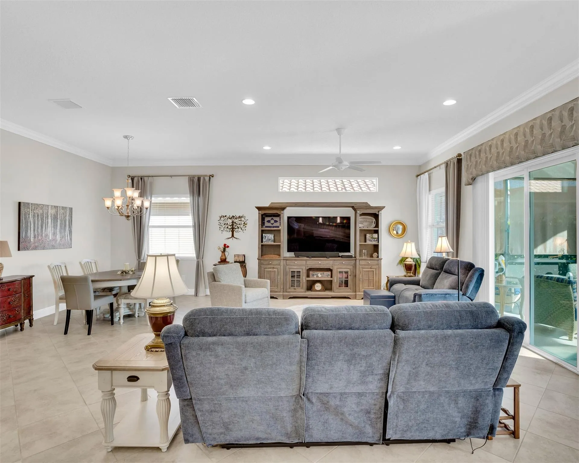 Sunrise kiss the living and kitchen areas with peaceful views of the lake and saltwater pool, where ducks and herons visit daily. A chef’s kiss kitchen offers soft-close cabinetry, wall ovens, and a cozy coffee nook with front-row lake views. Tile on the diagonal flows throughout and, the dry bar and den are a bonus The spacious primary suite boasts a stunning vanity and features dual walk-in closets. Impact glass, 2023 exterior paint, 2024 AC and HWH. This home offers thoughtful accessibility features, including a garage ramp for easy entry and a spacious primary bath with a wheelchair-accessible shower. Controls at the shower entrance provide both safety and comfort. A friendly, multigenerational community with great walking, biking, and a lovely rocking chair porch. Come, have a seat !