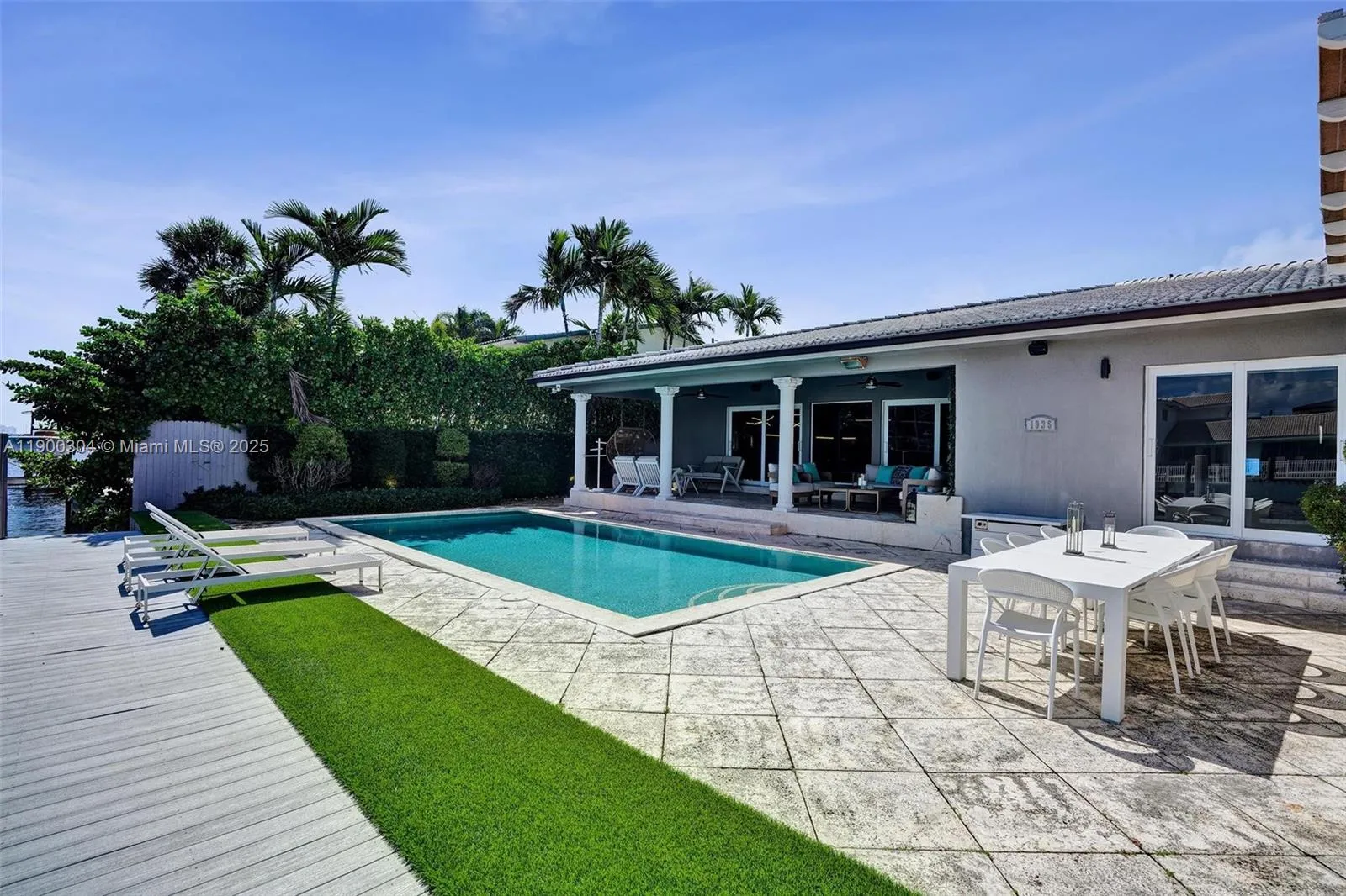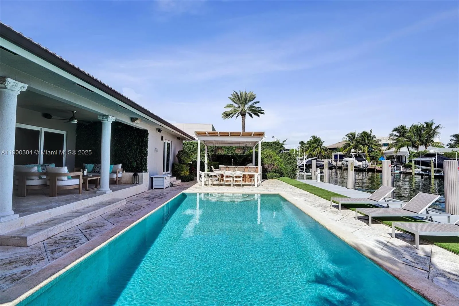 Live the Ultimate Miami Waterfront Lifestyle. Beautifully furnished and renovated with a resort-style backyard, featuring a pergola with summer kitchen and multiple lounge areas for seamless indoor-outdoor living. The interior showcases a spacious kitchen, custom bar with designer millwork, impact windows, blackout shades, and cabana bath. Enjoy ample storage w/ walk-in closets and an oversized garage with built-ins. Boater’s paradise with 75 ft of waterfront, no fixed bridges, Shore Power, and direct ocean access. Located in the Gated Sans Souci Estates with 24/7 police guardhouse—minutes to Bal Harbour, the Design District, and Aventura.