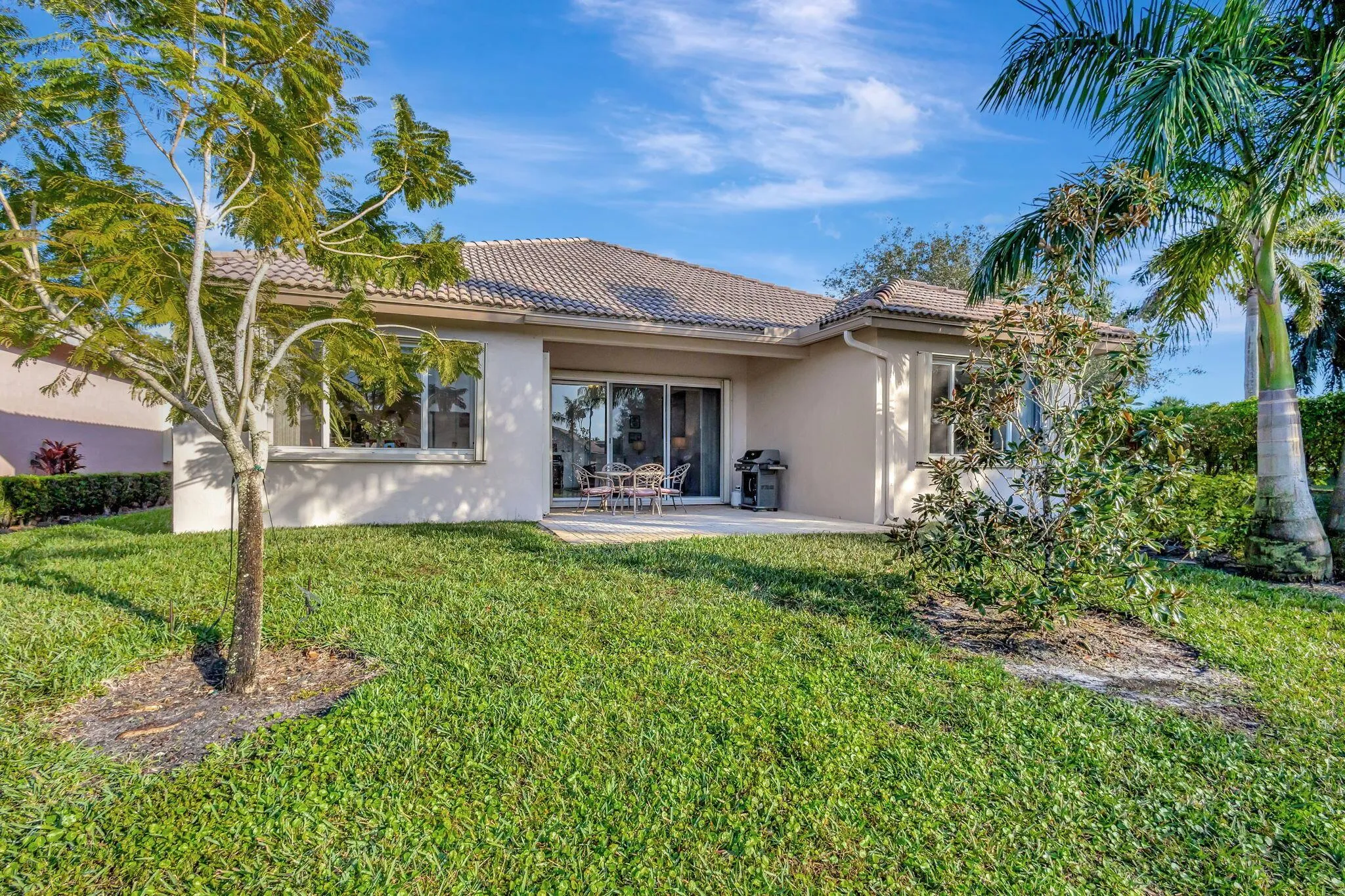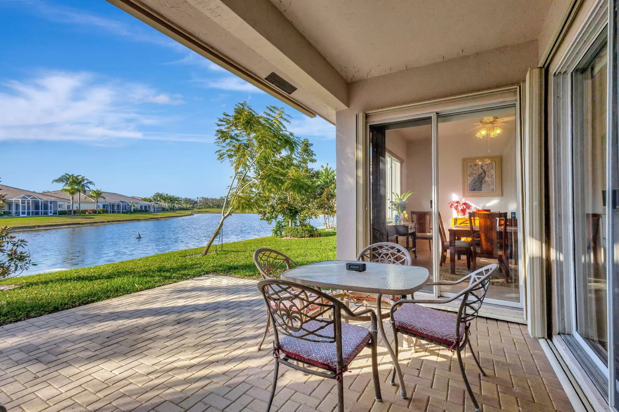 Immaculately maintained, this great room style floor plan features a large front covered patio and expanded back covered paver patio to relax and enjoy your morning coffee or afternoon wine. Reading the newspaper and watching the birds is a favorite activity here on Sailfish Cove. Upgraded kitchen featuring corian counters, and glass backsplash, 42” cabinets, 5 burner stove, and arts and crafts and/or breakfast table. Enjoy easy to maintain 24” porcelain tile floors in the living areas. Raised doors with ceiling fans and recessed lighting. Primary bathroom has raised cabinets and counters and a jacuzzi roman tub to soak the day away. Primary bedroom features 2 walk in closets. Wake up to peaceful water views. This home is part of your south Florida lifestyle. Yes, you deserve it!