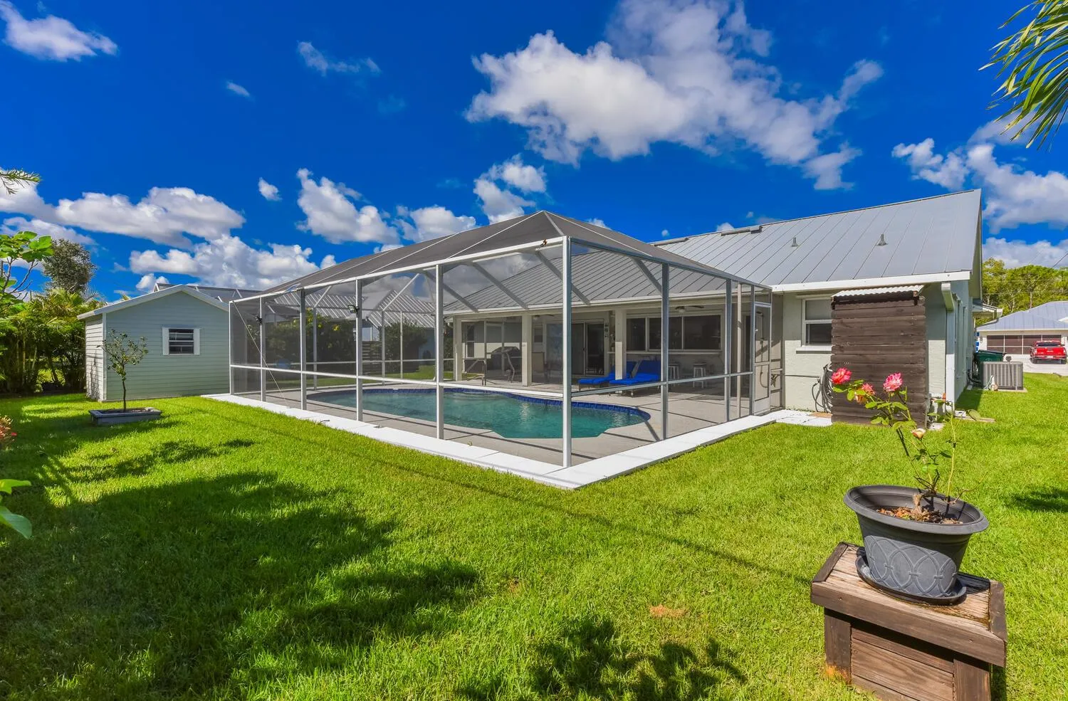 Superbly maintained 3/2/2 CBS pool home! Standing seam metal roof installed 2024. AC is 2020. Open floor plan with vaulted ceiling’s. Beautiful stone feature wall in living area. Open & bright kitchen has custom cabinets with pull outs, granite counters, stainless steel appliances (new dishwasher) & pass thru to the screened pool enclosure. Primary bedroom with en suite, dual sinks, soaking tub and separate shower, walk-in closets, tray ceiling & sliders to the lanai. Guest bedrooms have large closets & share cabana bath. Back yard features gunite pool, screen enclosure, shed wired for power, mature landscaping. Separate well used for a 4 zone irrigation. Painted driveway, shutters, garage cabinets round out this must see home – priced smart and includes a one year home warranty!