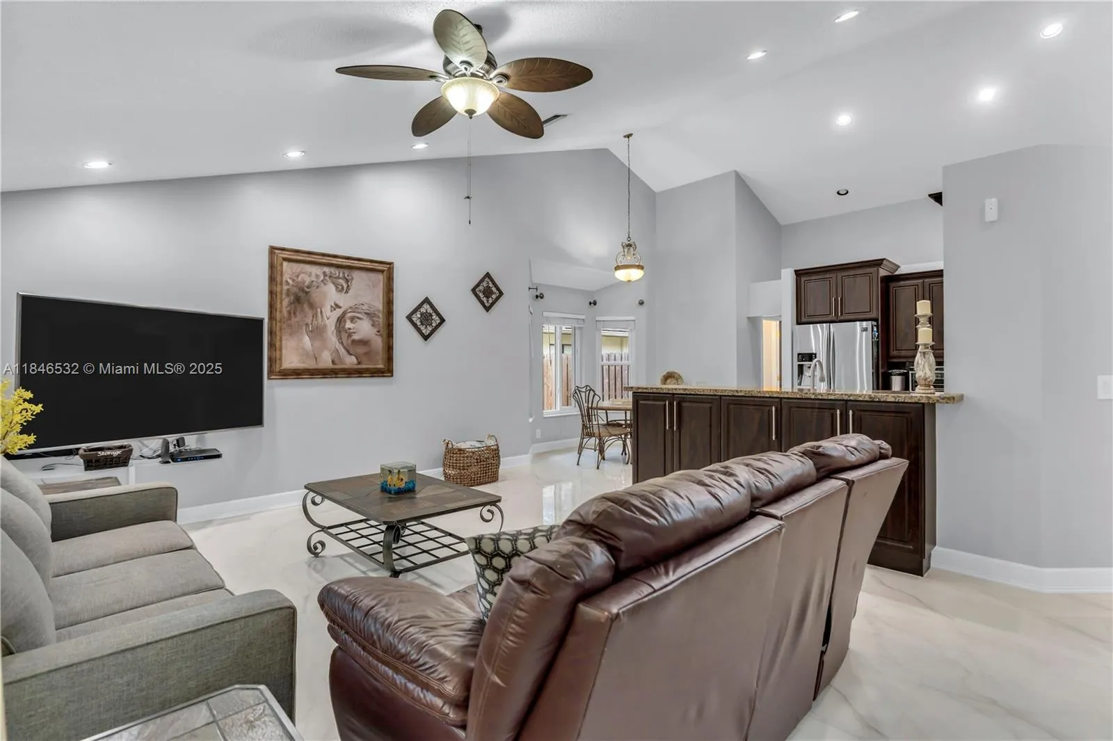 Stunning 4-bed, 2.5-bath ranch-style home in Coral Springs with modern upgrades throughout! Enjoy vaulted ceilings, oversized porcelain tile floors in the living areas, and a freshly painted interior. The spacious kitchen boasts stainless steel appliances and plenty of cabinet space with an open concept to the living room. The primary suite features tray ceilings and sliding doors that lead out to the pool area. A/C (2019) two thermostat dual zone unit. Water heater 2023. Impact windows and doors offer peace of mind, while the oversized paved driveway adds convenience for plenty of parking. Step outside to your private backyard oasis with a sparkling screened in pool—perfect for entertaining which includes specialty lighting. No HOA, great location, and move-in ready! Don’t miss this gem!