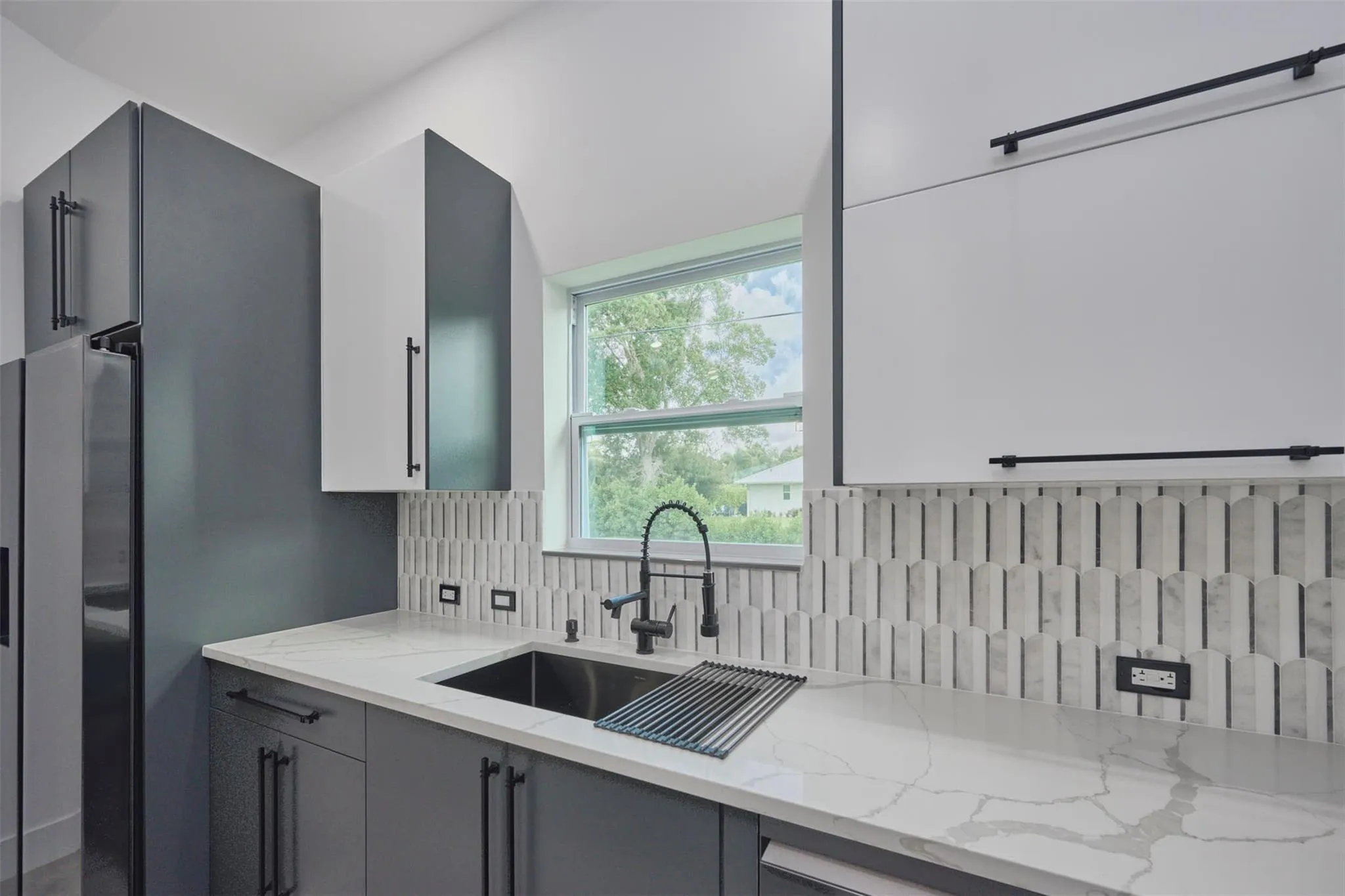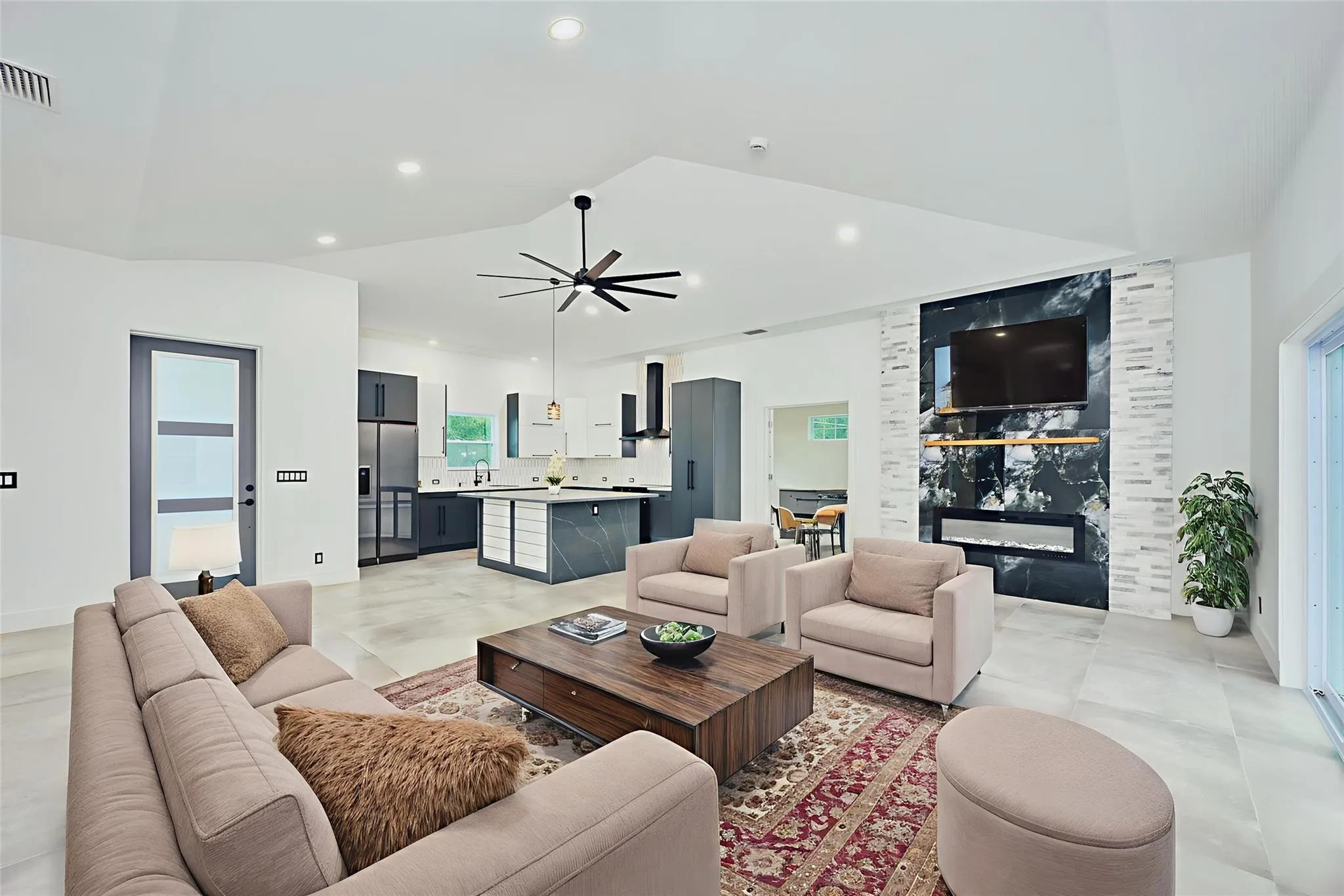 Custom built modern style 3 bedroom, 2 bath home on a corner lot. Open-concept layout that seamlessly blends style and functionality. Soaring vaulted ceilings, sleek marble floor and high end finishes throughout. Designed with smart home technology, functional elegance, and striking appeal, including dramatic tray ceilings for a truly sophisticated living experience. Designer-selected finishes throughout elevate the space. No HOA/no restrictions. Photos are virtually staged.