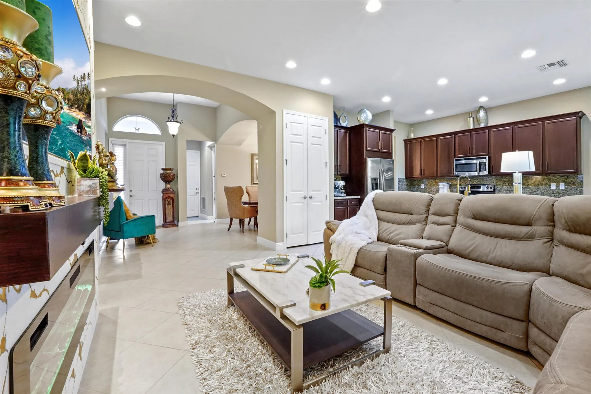 Welcome to this stunning single-family home, perfectly situated on a quiet circle in the desirable gated community of Portosol in Royal Palm Beach. The residence offers 3 bedrooms and 2 bathrooms with exceptional curb appeal, featuring attractive Mediterranean architecture with a tile roof, impact windoews a paver driveway, and lush tropical landscaping. A spacious, arch-covered entry leads to an elegant dark wood front door, setting a sophisticated tone from the moment you arrive.