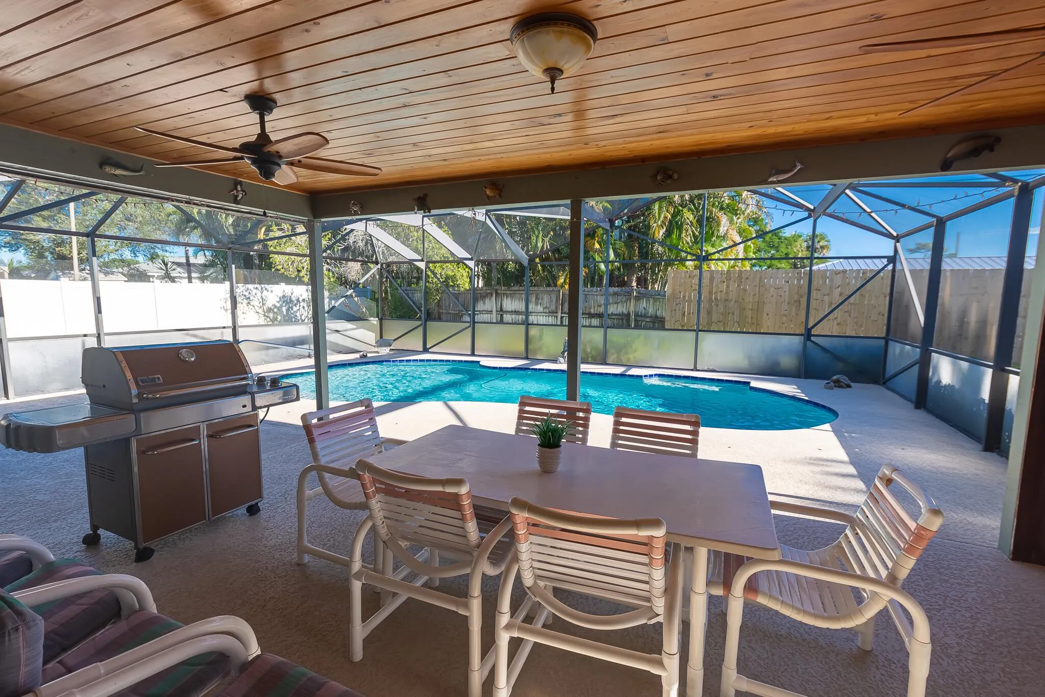 Well-maintained 3BR/2BA/2CG pool home with CBS construction, 2020 roof & water heater and 2018 A/C! Features include granite counters, stainless steel appliances, and a wood-burning stone fireplace. Enjoy multiple living areas–family, living & dining rooms–plus a wet bar and cabana bath. The primary suite offers a walk-in closet, dual sinks, tub/shower, and skylight. Outside, relax on the covered/screened lanai overlooking the beautiful inground salt water pool with fenced yard. Check it out!