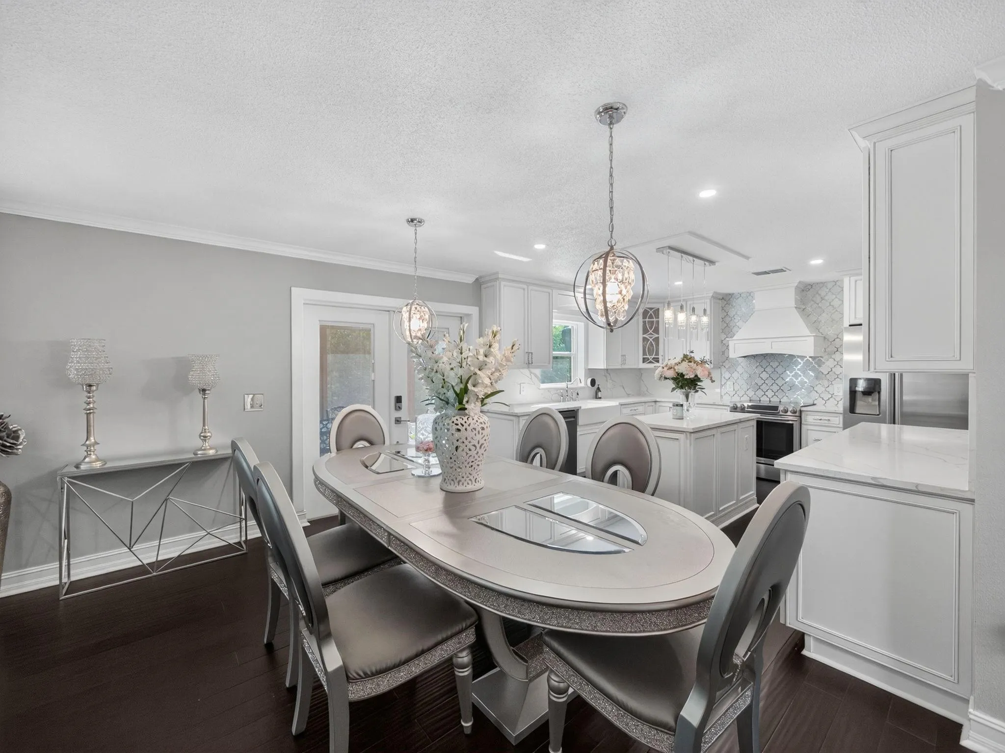 Beautifully updated two-story home featuring 5 bedrooms and 2.5 baths. The open-concept kitchen flows into a spacious great room, with separate formal living and dining areas filled with natural light. High-end finishes include designer backsplash, premium countertops, and elegant lighting throughout. French doors open to a private, landscaped backyard with mature trees and a large RV pad. Dual A/C units provide year-round comfort. Ample parking and no HOA—enjoy luxury and freedom in one perfect home.rnRV pad, located to the right of the house next to driveway. Features 50 amp RV electric connect, public water supply and RV sewer drain quick connect.