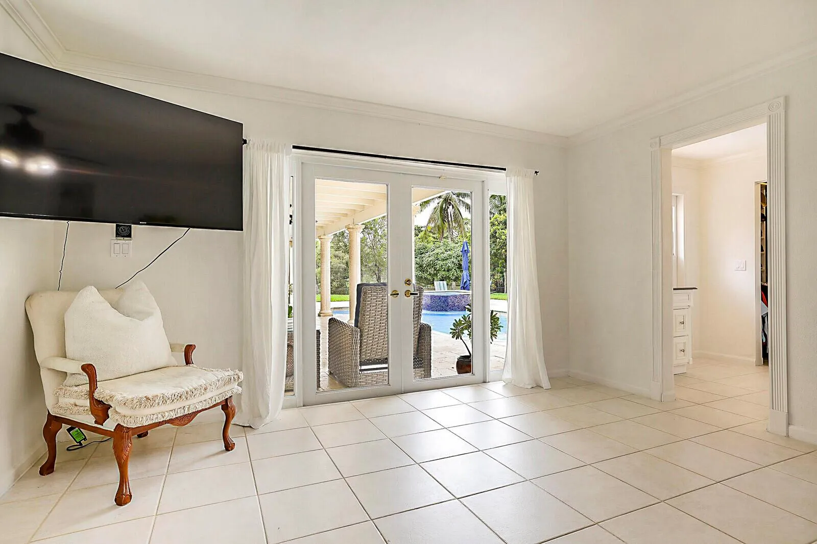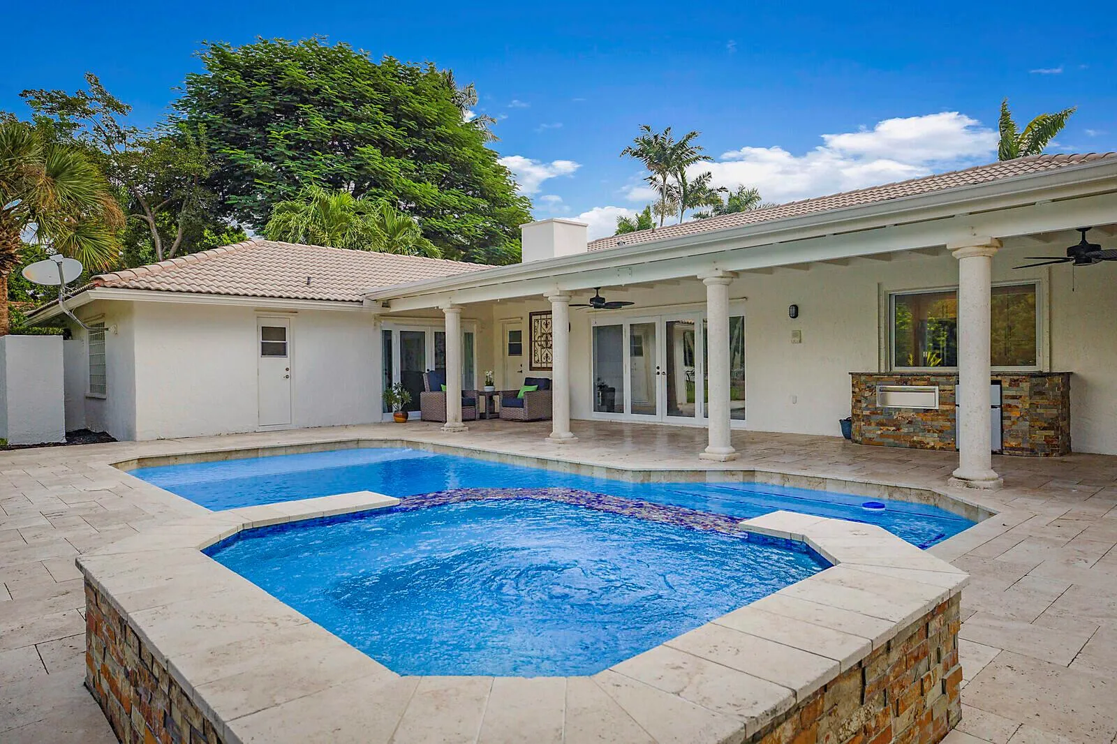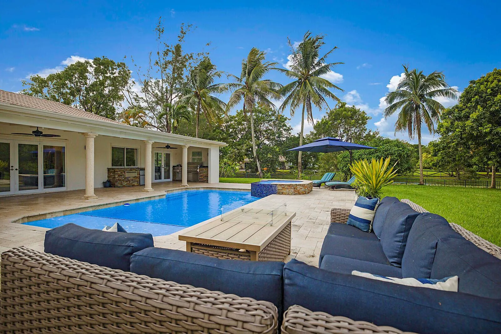 Welcome to Paradise – If you treasure privacy & tranquility, appreciate nature, enjoy entertaining, love cooking, like relaxing in the heated, resort-style pool & spa AND want to be away from the traffic yet close to all the conveniences, THIS IS FOR YOU! The fenced, acre estate with oversized circular drive is sided by rippling water & surrounded by beautiful trees. Enter through custom Mahogany double doors into the foyer adjacent to the formal living & dining rooms. Beyond is the family room w/a fireplace, French Doors & high ceilings. The dream kitchen features white Shaker cabinets, quartz counters, stainless steel appliances, + a center island w/cooktop & contrasting dark blue cabinets. There’s also a large pantry, a coffee bar & wine cooler.