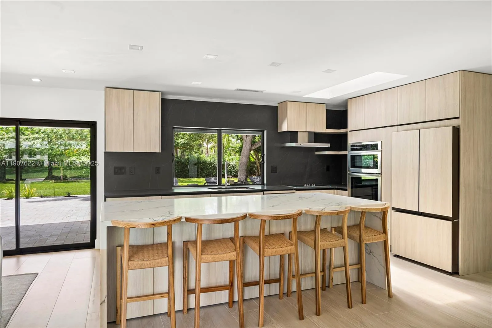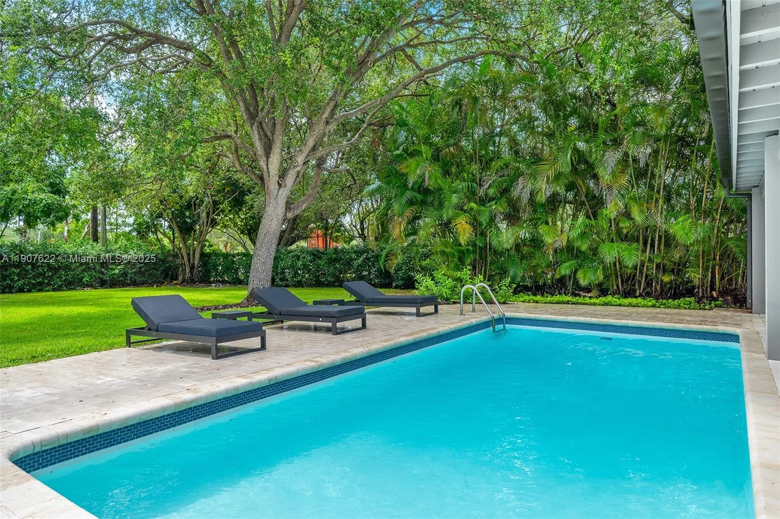 Meticulously redesigned with luxury finishes and impeccable taste—this home is move-in ready and has neverrn been lived in. Located on a unique oversized 21,875 sq ft corner lot, surrounded by lush landscaping and majestic trees that provide exceptional privacy. Features 5 bedrooms, 3.5 bathrooms, and 2,438 sq ft under A/C (per builder). Open living, dining, and kitchen showcasing custom elements not commonly found on the market:rn natural stone, wood accents, and stainless steel appliances. The primary suite includes a built-in bookshelf, custom walk-in closet, and spa-like bath. Second suite with cabana bath. Expansive 55-ft covered terrace creates an elegant outdoor living and dining area. Impact windows, new metal roof, 1-car garage with laundry. A rare market gem.