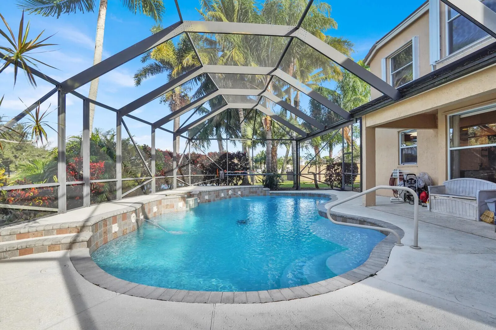 Stunning 5BR/3.5BA two-story home in desirable Smith Farm, Lake Worth! Set on an oversized pie-shaped lakefront cul-de-sac lot, this property offers privacy, great schools, and resort-style living. Enjoy a new 2024 roof, screened gaming pool (shallow ends/deep middle), and spacious lanai. The first floor features a guest suite with en suite bath, updated kitchen with stainless appliances(new dishwasher) & cherrywood cabinets, and open living areas. Upstairs boasts 4 bedrooms including a private master wing with huge walk-in closet, updated bath, and new carpet . A loft with balcony is perfect for an office or media room. Laundry upstairs. A true gem with ideal layout, upgrades, and unbeatable location! Custom bar and pool table included with full price offer.