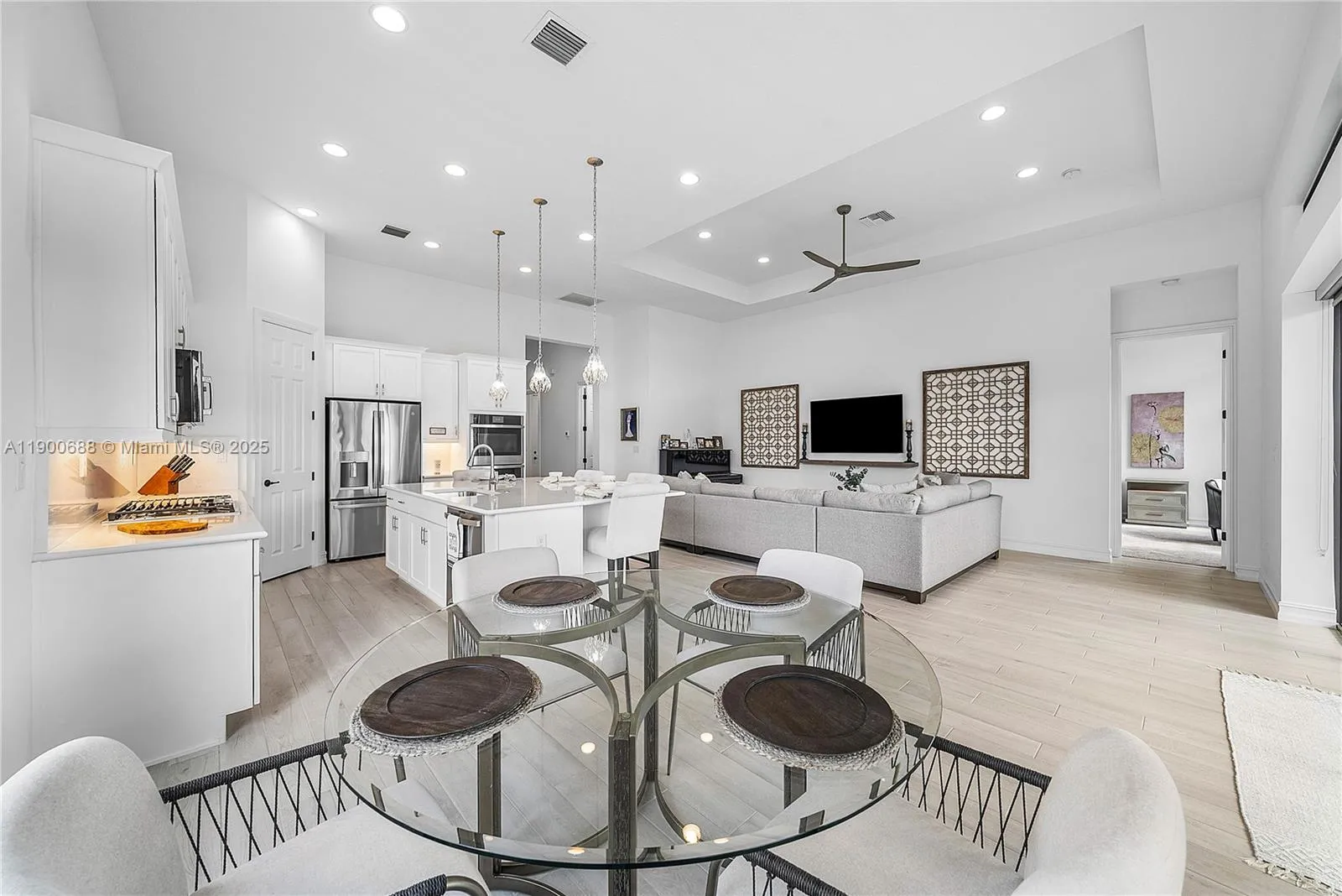 Almost New Immaculate 2022 Barely lived in Turn-key True 3 bedroom 2.5 bathroom Single story 2 car garage home in the exclusive 24hr guard-gated Four Seasons community Parkland. Split, open airy floorpan. Elegant neutral color palette, tray ceilings, and plenty of storage. Kitchen hosts an oversized center island, double ovens and walk in pantry. Primary suite offers 2 ample closets, large shower and dual sinks. Separate laundry room with sink and additional cabinets. Home sits on an oversized fenced in pie lot fitting for the backyard and pool of your dreams. Covered screened in patio. Wired for alarm and lighting fixtures. Community amenities such as cafe, resort style pools, ballroom, bbq area, pickleball/tennis and full gym make living at the Four Seasons the ultimate luxury lifestyle.