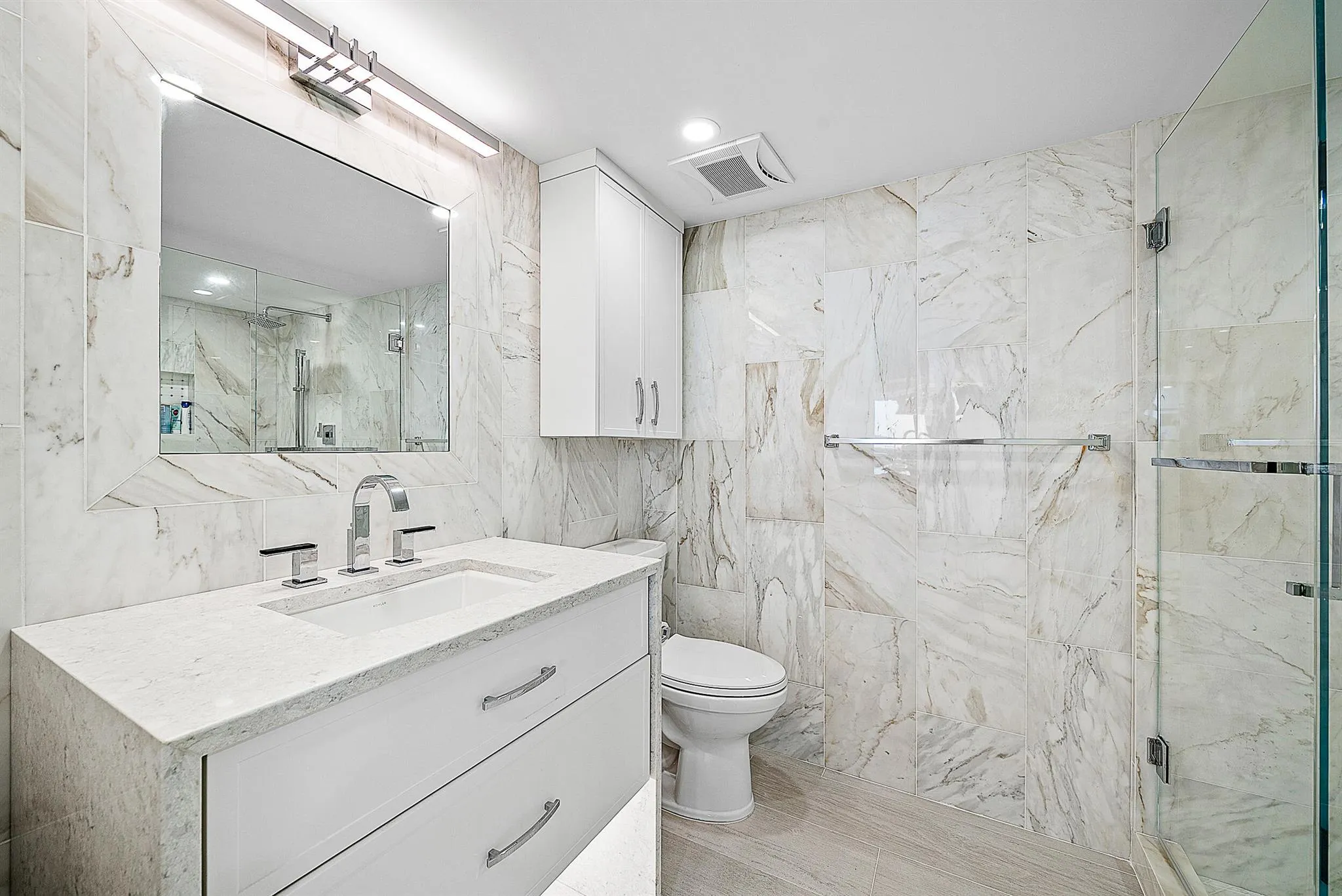 Completely remodeled down to the studs in November 2022, this exquisite 2BR/2BA residence in Marina Tower at Old Port Cove offers luxurious modern living with breathtaking water views from every room. Enjoy seamless indoor-outdoor living with an expansive wrap-around balcony perfect for entertaining or taking in year-round sunsets over the Intracoastal. Every inch of this home has been thoughtfully upgraded — featuring new hurricane-rated doors & glass, high-end fixtures for plumbing & lighting, electric window shades with remotes in every room, upgraded interior doors with smoked glass & hardware, new washer & dryer (2023), and all lights on dimmers.
