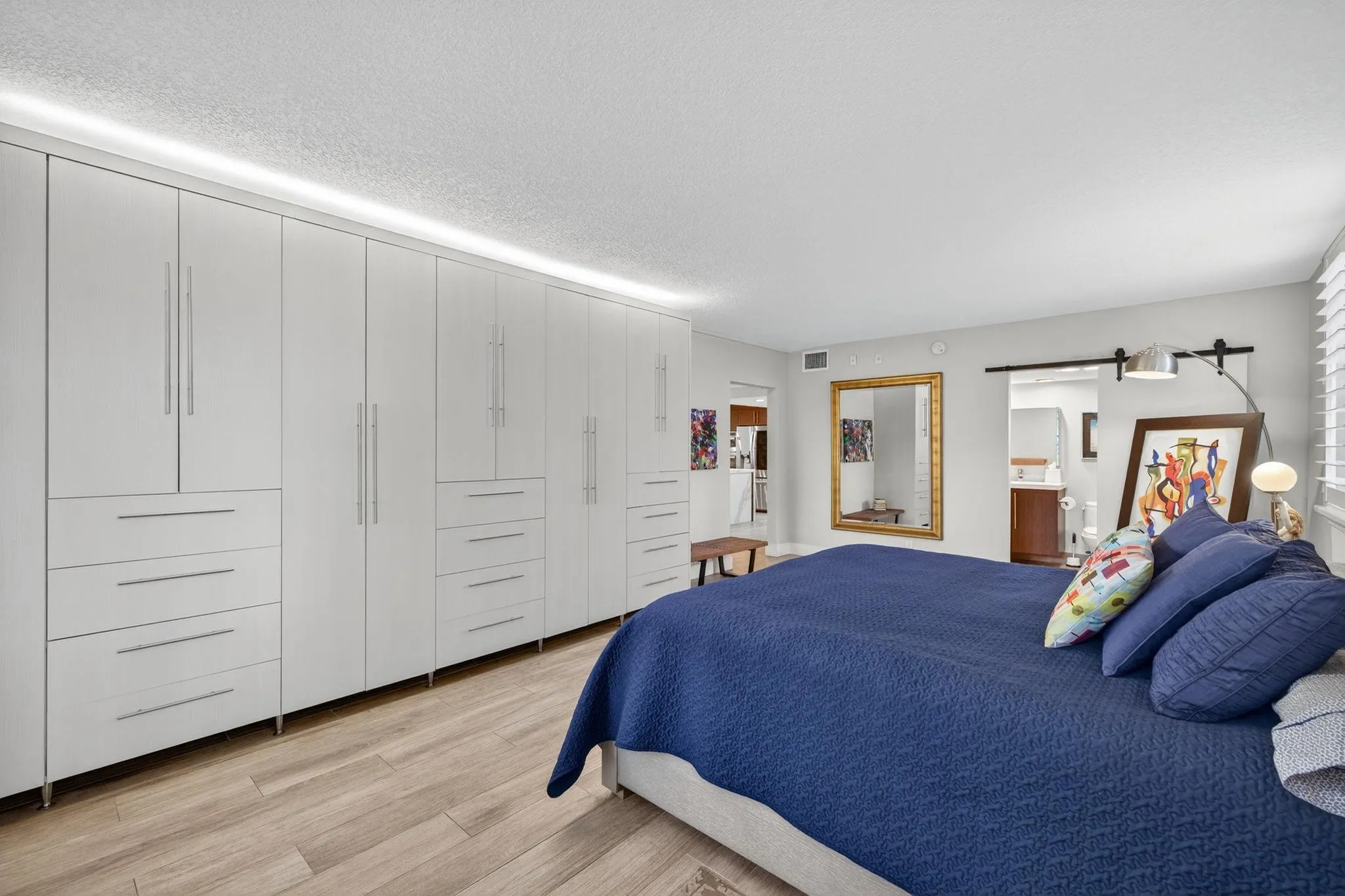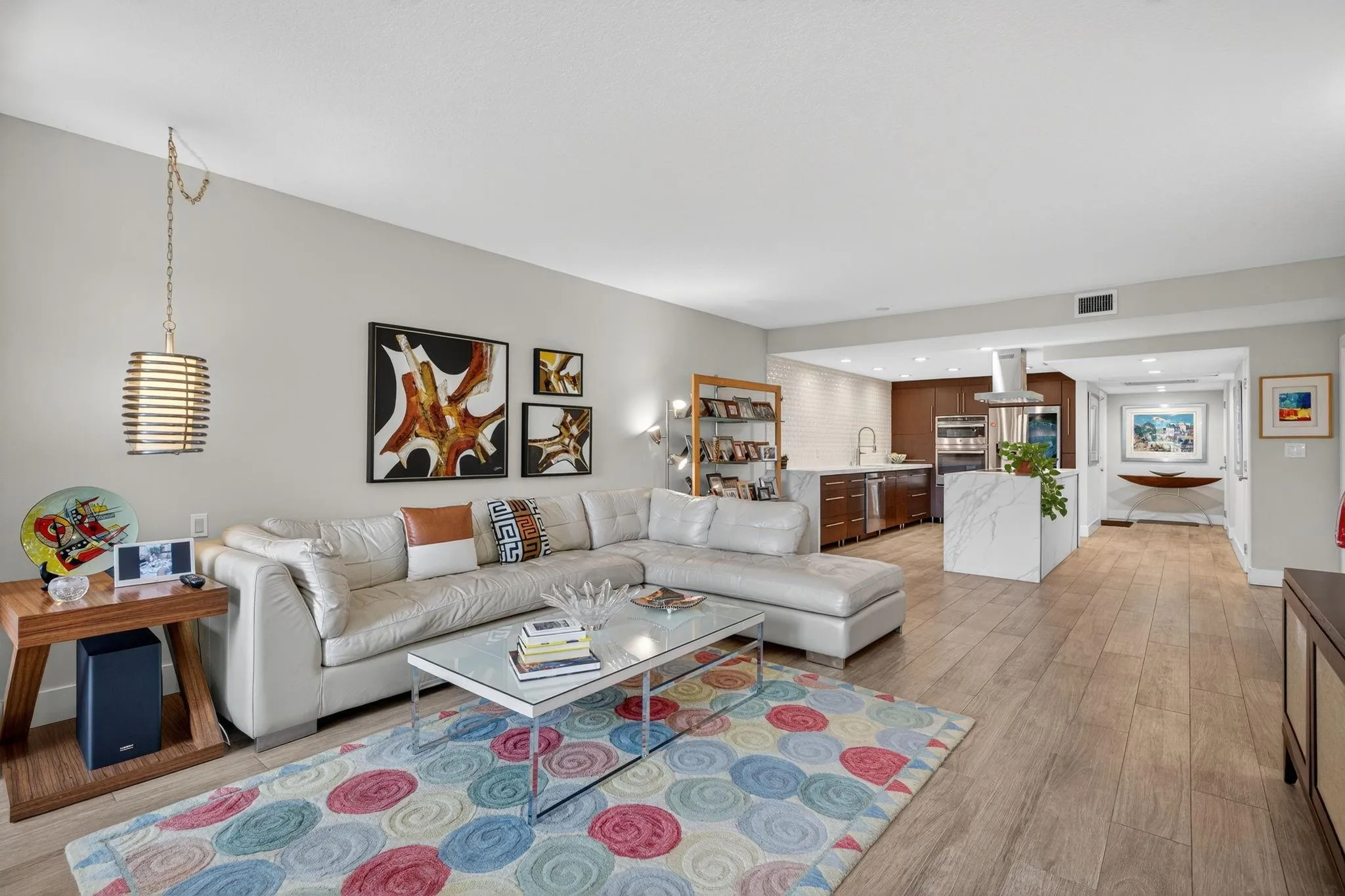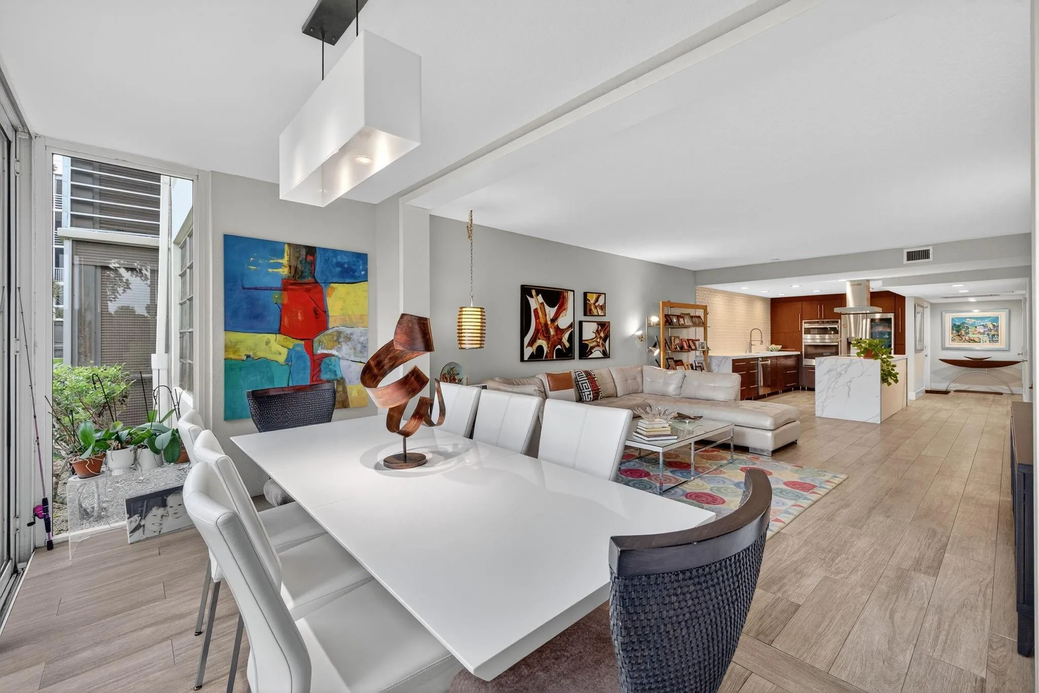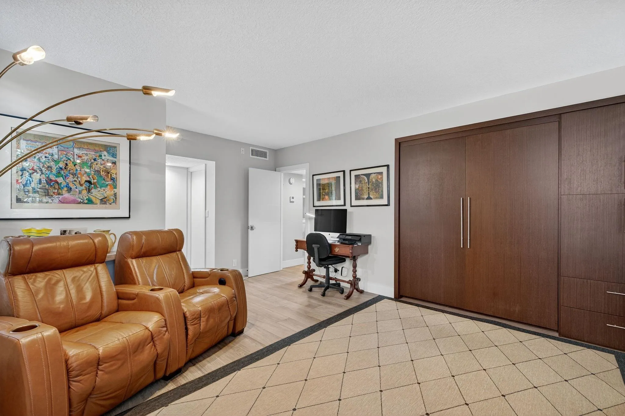 This is a must see! Come and take a look at this fully renovated, 1st-floor, corner condo featuring a contemporary open concept kitchen with high-end stainless-steel appliances. This residence also features FULL IMPACT WINDOWS INCLUDING THE GLASS ENCLOSED PATIO as well as beautiful flooring throughout. The glass enclosed patio/dining area provides a tranquil view of the golf course. The 2nd and 3rd bedrooms have been combined to create a very spacious (25′ x 14′) master suite with extensive custom-built cabinetry with ample storage for clothes, etc. The “original” master bedroom (16’x15′) features an en-suite bathroom and a custom-built queen size murphy bed (barely used) and is included with the sale. The condo fees include cable tv, water, exterior insurance, landscaping, etc.