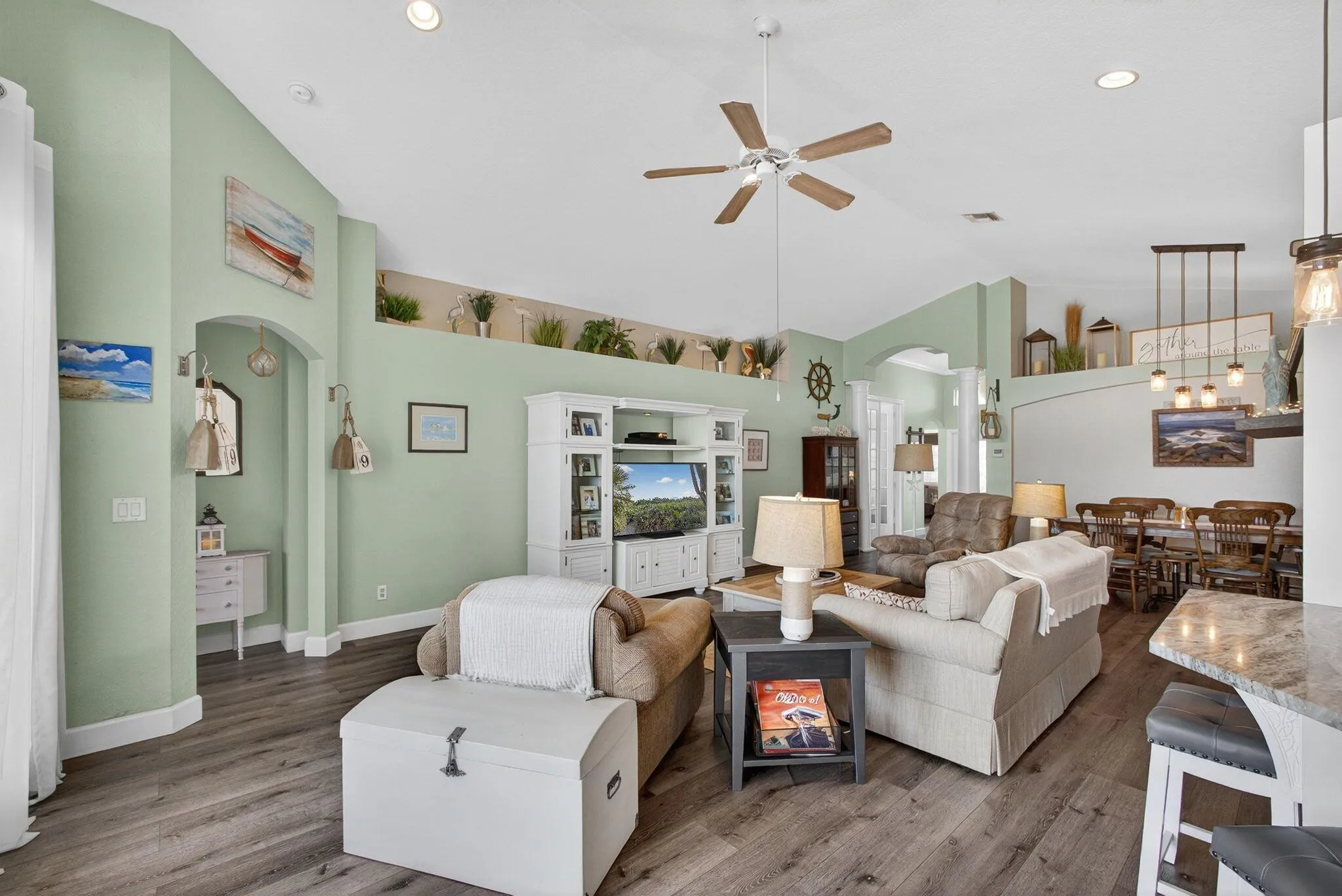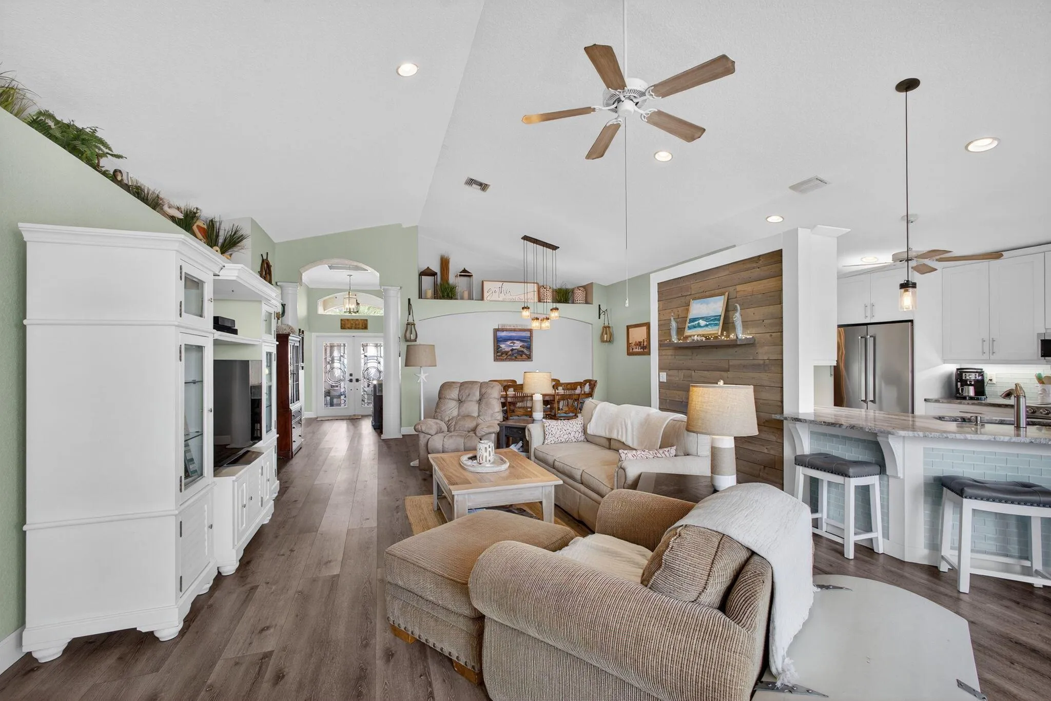 Welcome to 12455 SE Plandome Dr — a beautifully updated 3-bed, 2-bath CBS home offering 1,879 sq ft of bright, coastal-inspired living in the highly sought-after community of Hobe Sound. Built in 2003 on a 6,534 sq ft lot, this home delivers modern upgrades, an open layout, and an unbeatable location just 2 miles from the pristine beaches of Jupiter Island.Step inside and feel the warmth of the natural light pouring through the high-impact rear sliders and transom windows. Soaring ceilings enhance the spacious feel, while deluxe vinyl plank flooring flows through the main living areas, creating a seamless and stylish foundation. The kitchen is the heart of the home — updated shaker cabinetry, stainless-steel appliances (2019), granite counters, pendant lighting, backsplash, and a large