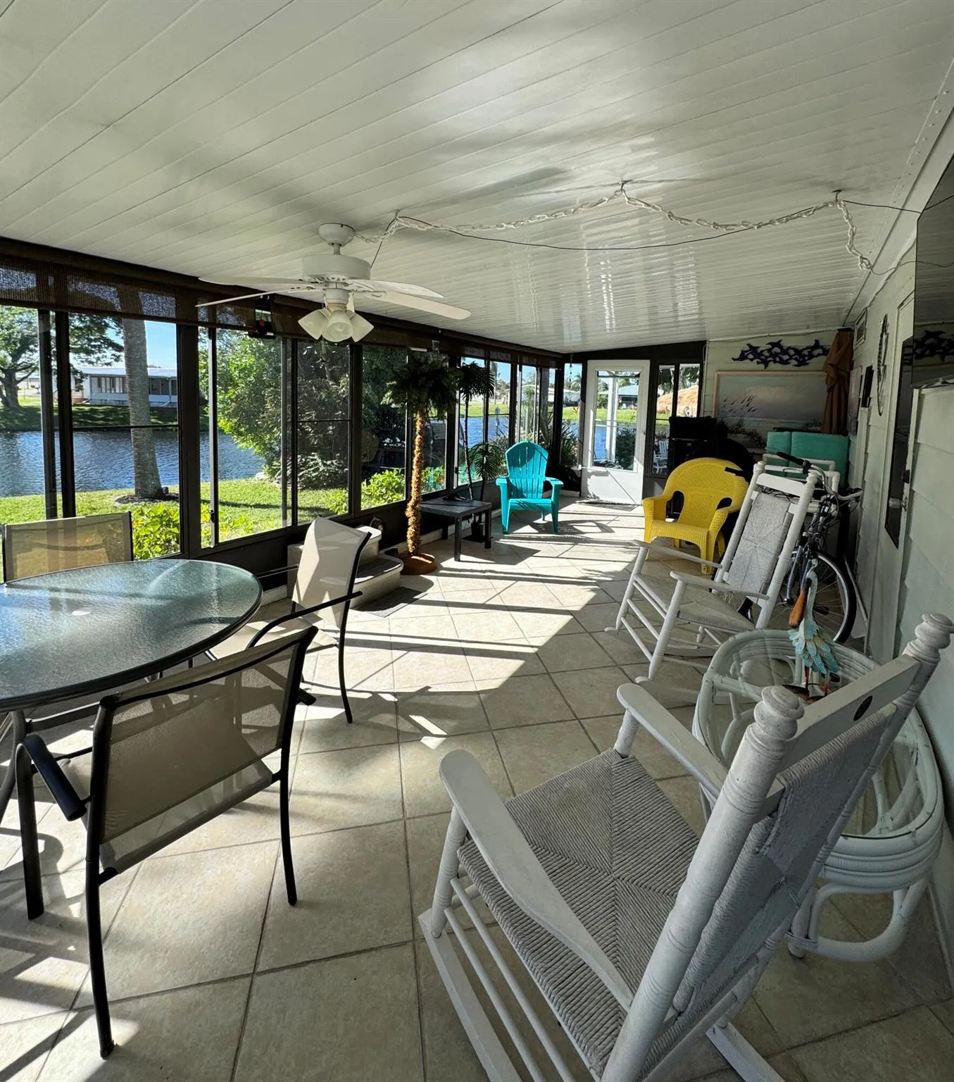 Lovely 2-bedroom 2-bath Lake view home. This home is located in the desirable 55+ Spanish Lakes Country Club Village community. The home has a beautiful lake view on two sides–screened-in patio which has windows that can be closed for future A/C. Patio is overlooking the lake, great for morning coffee and evening cocktails. Added a 12X28 Patio for enjoying the Florida sun. This home has laminate and carpet flooring. The home has built-in shelves in the dining area that provide additional storage. The primary suite bathroom has a built-in jewelry cabinet, new toilets, and a vanity. Roof is 2022, Vapier barrier and tie downs 2022. Brand New 2025 Carport. Home is being sold partially furnished. Lawn care and trash removal are included in the lot rent. 2 pools, shuffleboard