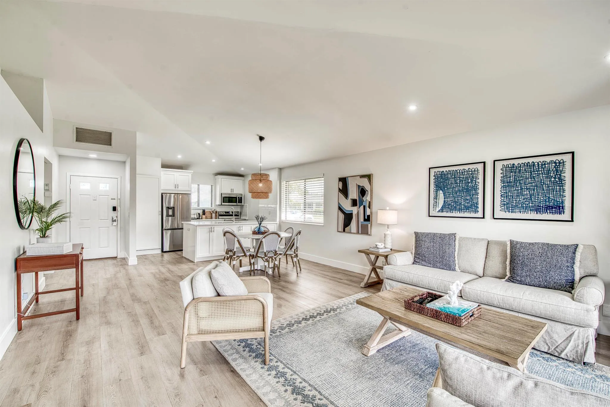 Nestled within the prestigious PGA National community, this charming two-bedroom, two-bath townhouse offers a wonderful blend of comfort, style, and convenience. Measuring 1,135 square feet, this fully furnished residence is ideal as a primary home, seasonal retreat, or investment opportunity, currently part of the sought-after PGA Rental Program, already rented for January, February, and March of 2026. Inside, a bright and open layout creates a welcoming sense of space. The interiors are appointed with white oak luxury vinyl flooring throughout and walls painted in a soft linen palette, setting a calm and contemporary tone. The main living area combines the kitchen, dining, and living spaces into one harmonious design, perfect for both relaxation and entertaining. The living room feels