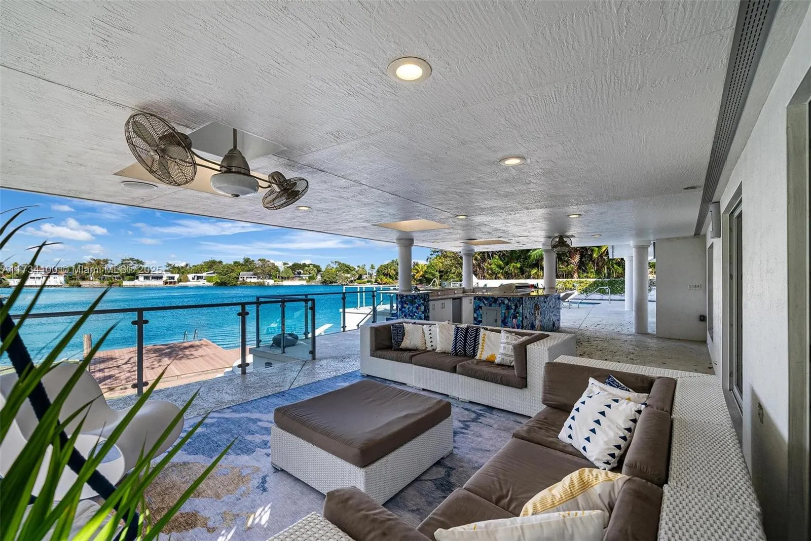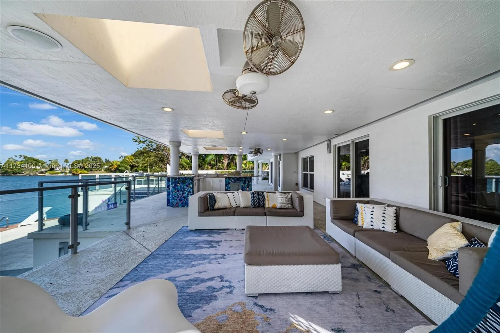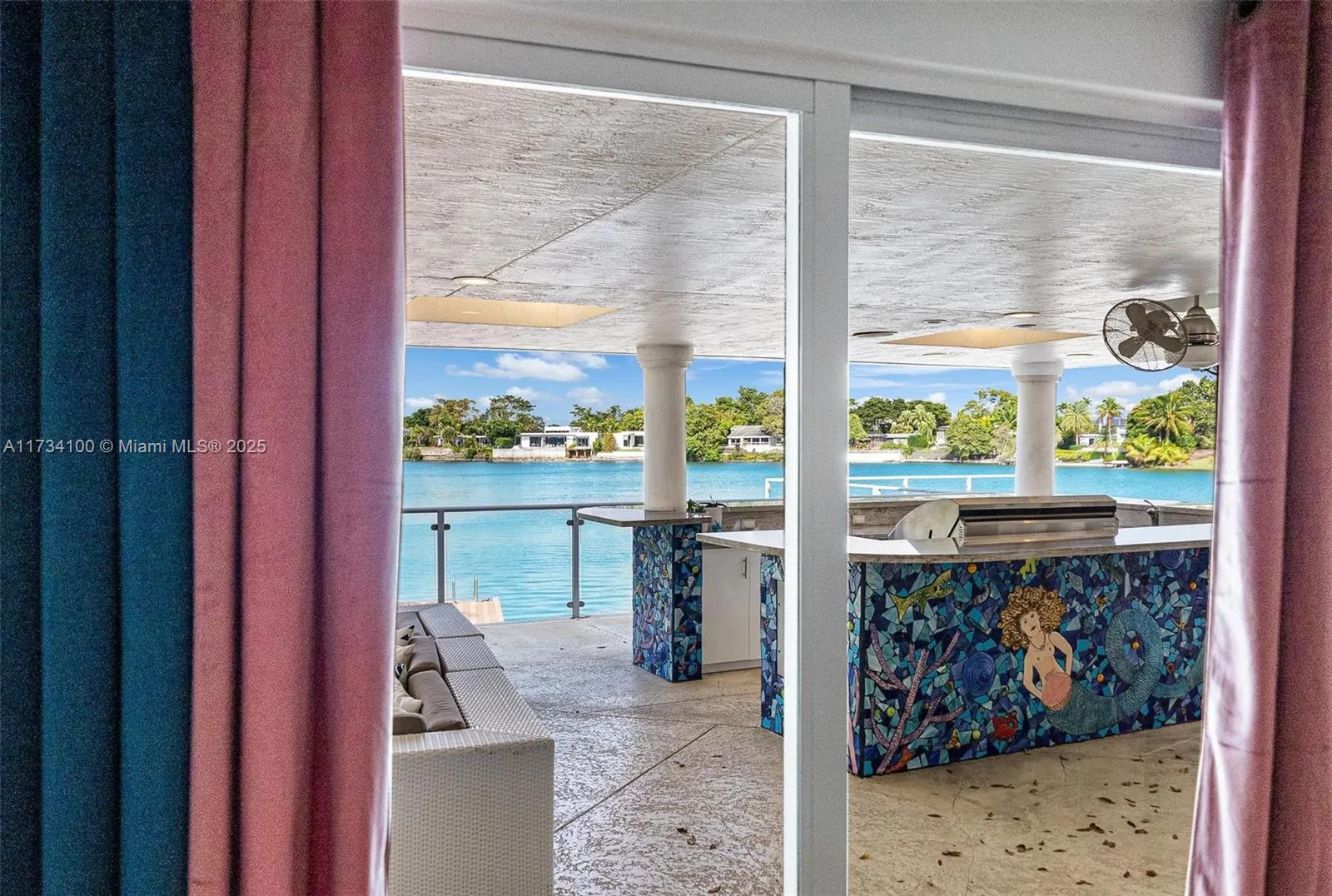 Welcome to the most iconic artist-inspired home on Sky Lake! This serene oasis features unparalleled privacy, views and the largest usable lawn space on the lake. The stunning 5-bed, 4-bath home sits on over 12,000 s/f and boasts 105 ft of waterfront with a dock, diving board, under-home lake/lawn toy storage, an elevated terrace with full outdoor kitchen, cool deck, pool and glass railings. The exterior facade, outdoor bar, pool and shower showcase mosaic features by renowned artist Carlos Alvez. Move-in ready with all impact windows, newly serviced TPO roof, and soundproofed music studio/in-law quarters. Plans paid for by seller and available for contemporary renovations by celebrity interior designer. Conveniently located near beaches, Aventura Mall, dining, parks and houses of worship.