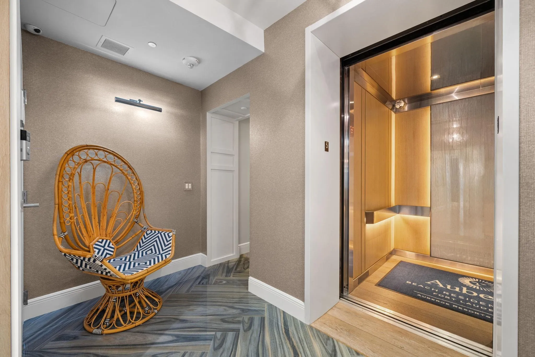 Experience opulent coastal living in this showstopping corner flow-through residence with panoramic exposure from ocean to city. Floor-to-ceiling glass nearly wraps the entire home, capturing direct sunrise ocean views to sunset Intracoastal and skyline vistas, with spacious terraces on both sides. Enter through a private foyer to blue porcelain herringbone floors, custom millwork, and an octagonal dining ceiling framing a designer chandelier. Features include 3 bed, media lounge & office, 5 baths, expanded primary suite with quartz dressing room, Control4 smart system for seamless luxury living. Auberge delivers the ultimate resort lifestyle with world-class amenities, beach and pool attendants, on-site dining at the new oceanfront restaurant Delmar, and holistic treatments at Evara Spa.