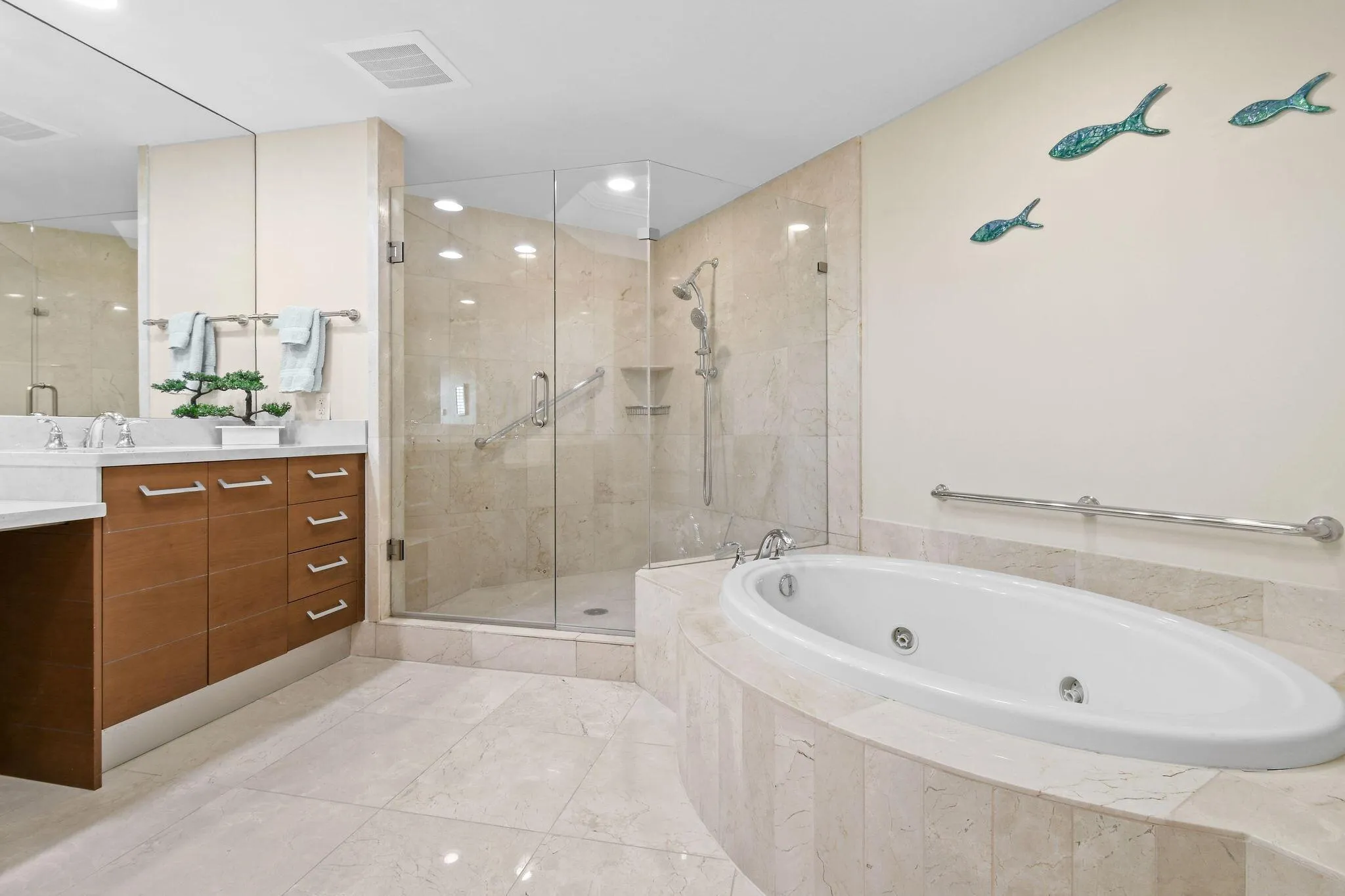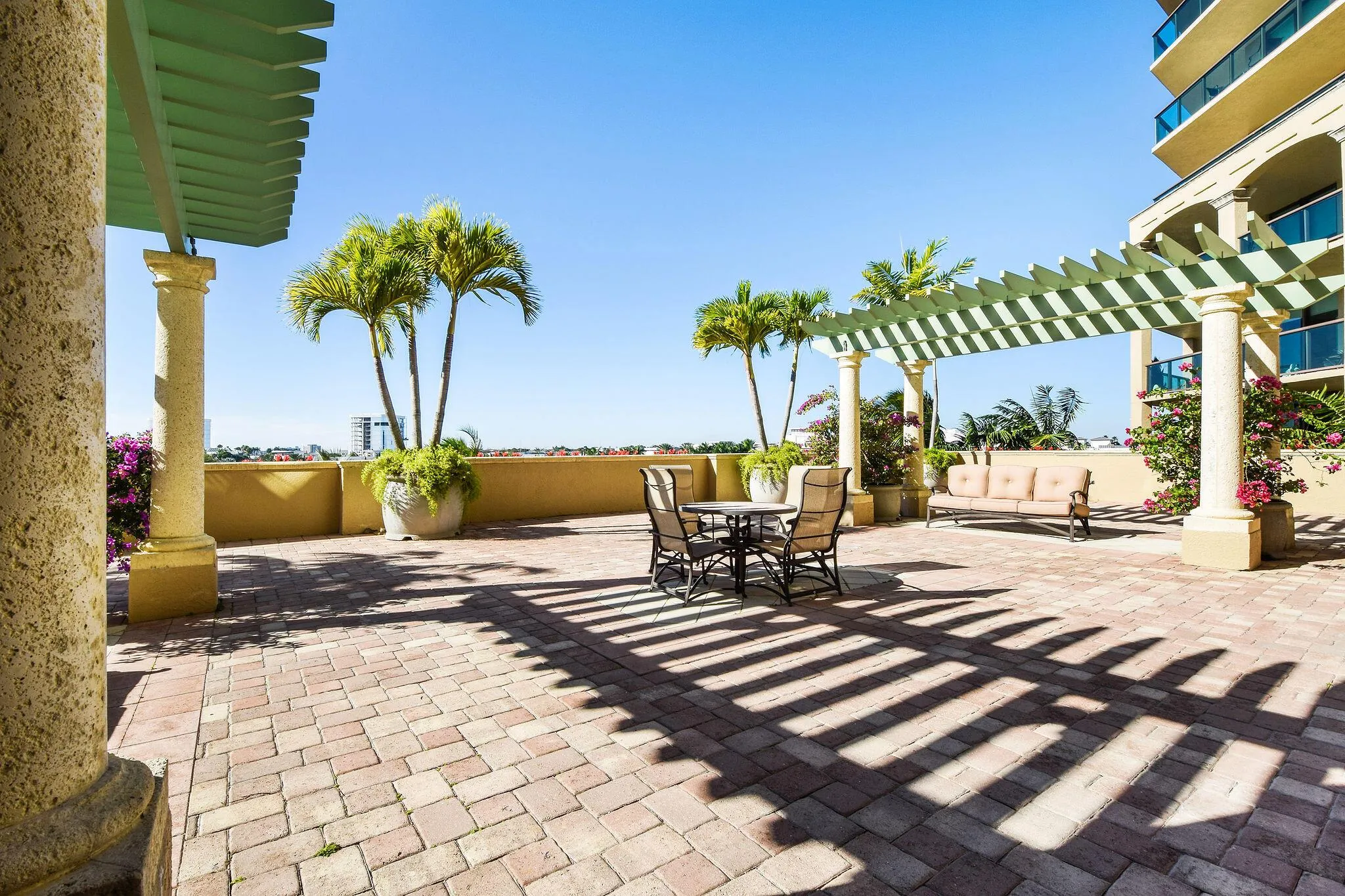 Luxury abounds in this stunning, meticulously upgraded condo at The Landmark at the Gardens that is very financially strong with superior reserves! The spectacular kitchen–fully redesigned by Waterview Kitchens–features custom high-end cabinets & appliances including: Thermador paneled dishwasher & 42” Sub-Zero refrigerator, Thermador Masterpiece oven & matching speed oven, Thermador induction cooktop, vented hood, spice drawer + countless additional custom touches. Interior enhancements include 30” diagonal porcelain tile, plantation shutters, impact windows & doors, crown molding, solid-core doors, & modern lighting & fans. The primary bath is a serene retreat w/ a jetted tub, double vanity, Toto Neorest toilet & marble tile. The home also offers 2 new Bosch A/C units w/