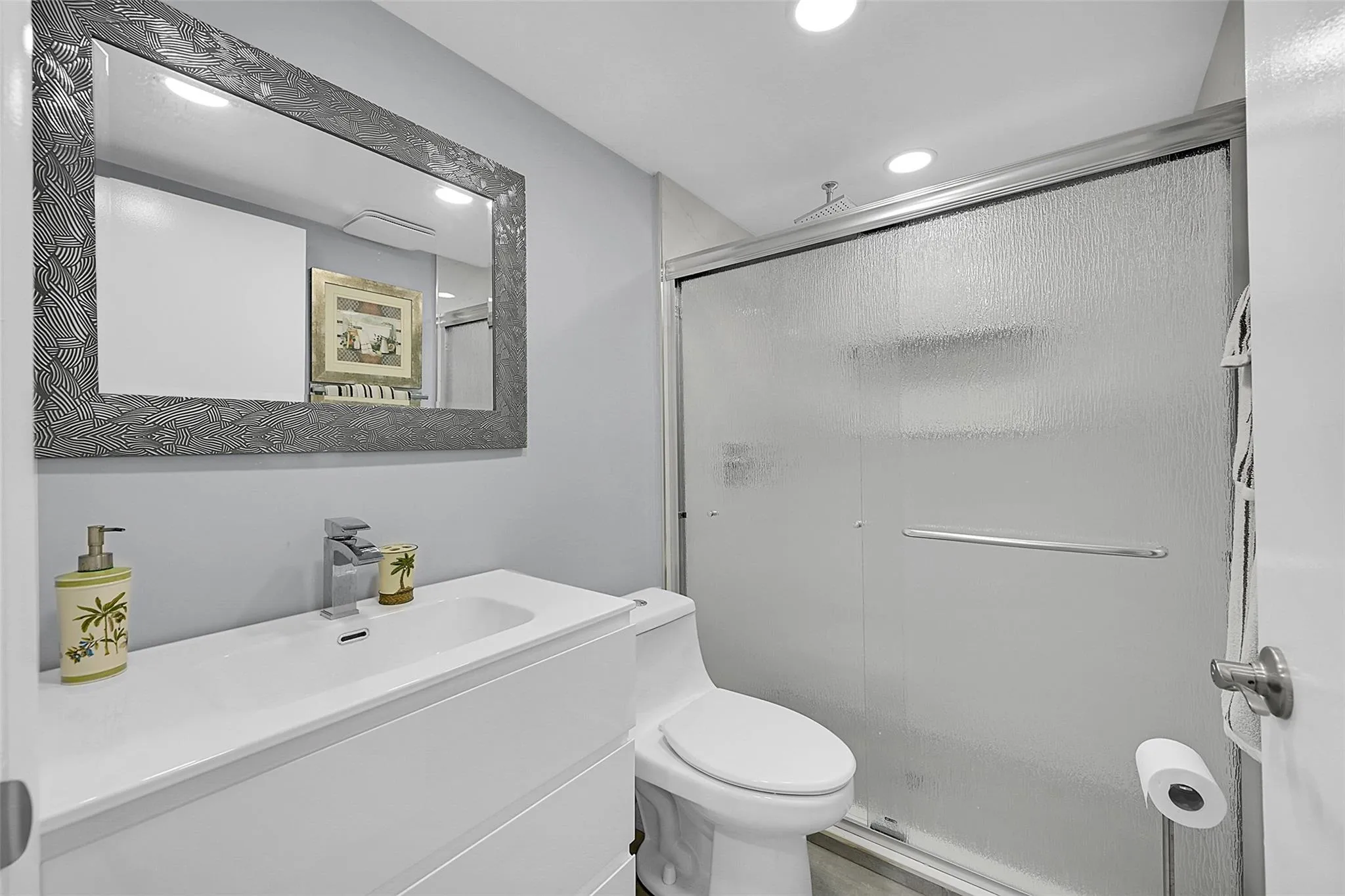 Beautifully renovated ground-floor 2BR/2BA condo with modern finishes throughout. Features include newer vinyl laminate flooring, LED high-hat lighting, and a fully updated kitchen with white shaker cabinets, quartz countertops, and new stainless-steel appliances. Both bathrooms have been completely updated. Enjoy a private screened porch with washer and dryer included. Incredible golf course views from the living area. Side entrance offers quick access to your assigned parking space. Kings Point offers true resort-style living with indoor/outdoor pools, theater, gym, bistro, café, two golf courses, courtesy buses and more. Perfect 55+ community lifestyle. This property is a must-see!