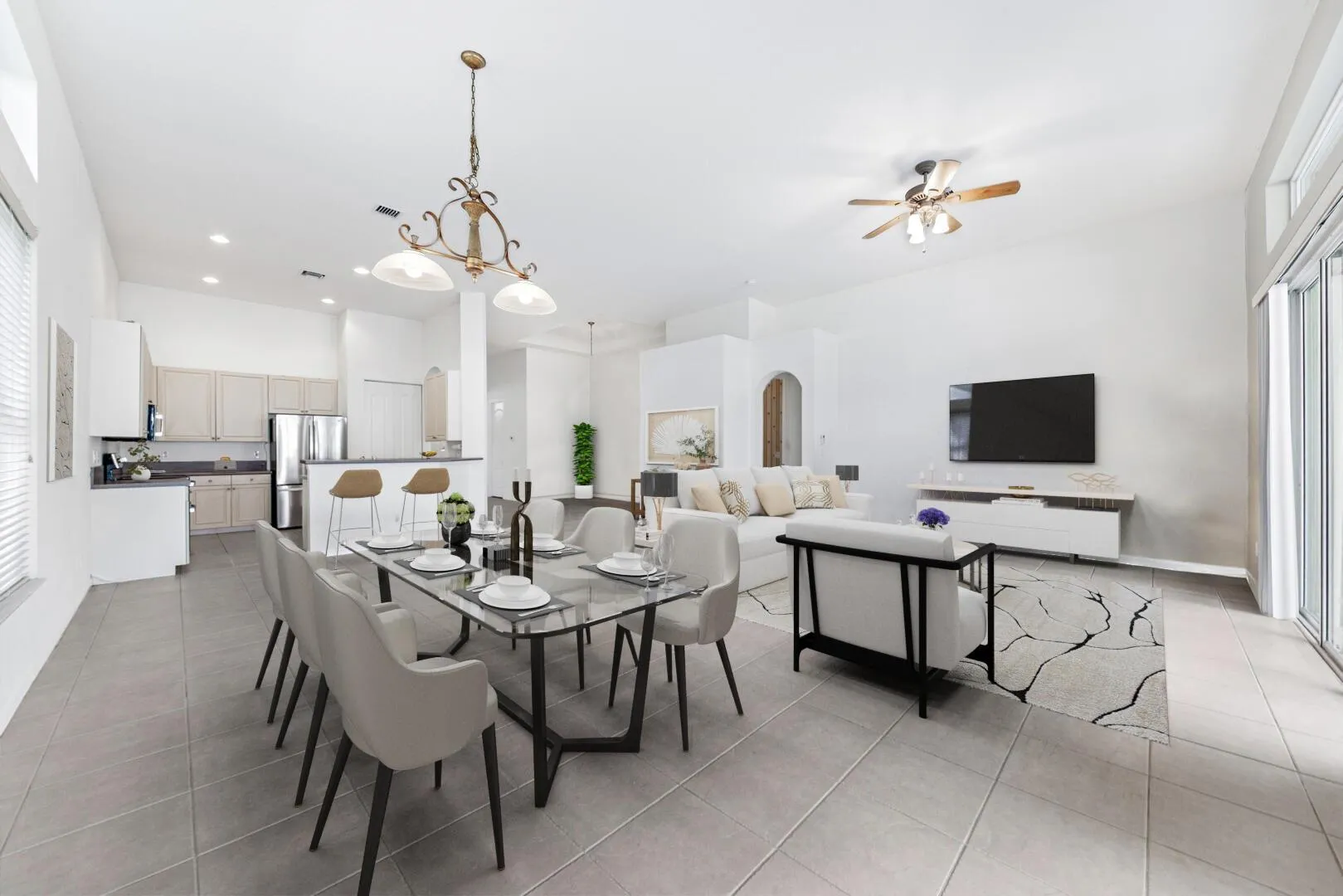 Welcome to this beautifully maintained 2-bedroom plus den, 2.5-bath home in the desirable community of Mitzner Falls. A welcoming double-door entrance opens to an airy, open floorplan enhanced by smooth walls, neutral flooring, brand new carpets and abundant natural light. The spacious kitchen is ideal for everyday living and entertaining, featuring new stainless-steel appliances, a pantry, and a convenient snack bar. A well-appointed laundry room with a storage closet adds to the home’s functionality. The primary suite offers comfort and privacy with a door to the patio, two walk-in closets plus an additional standard closet. The luxurious primary bathroom includes dual sinks, a soaking tub, a walk-in shower, and a linen closet.