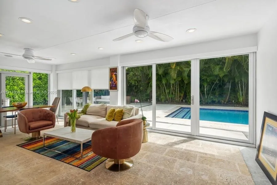 This beautiful Mid Century Miami Modern 4BED/3BATH home is waiting for its’ new owner! This homernconveniently rests on a big quite lot in sought after Beverly Gardens! Upon entering you will be wowed by a Light-rnfilled open living spaces, including expansive sunroom w/ walls of glass overlooking tranquil pool. A generousrnkitchen invites you in with an abundance of Custom kitchen w/ wood cabinetry, granite countertops, Mielernappliances & cooking island w/ bar seating.Main bedroom suite provides you with room to unwind with a sizablernwalk-in-closets, while an en-suite bathroom features a double vanity sink, rainfall shower, and an abundance ofrncloset space. second master bedroom with walk in shower equipped with hansgrohe fixtures