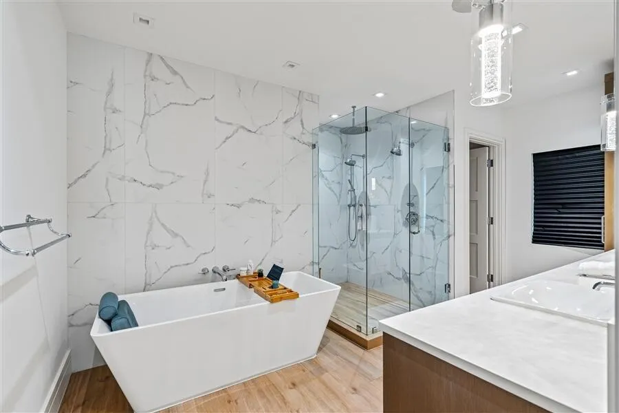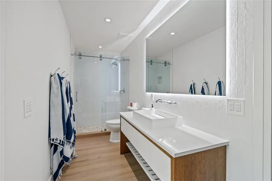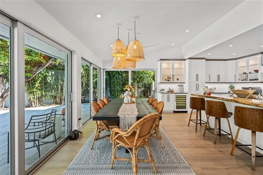Custom Lake Ida residence, built in 2020, offers privacy at the end of cul-de-sac. Sunlit streamlined interiors showcase a pleasing white-on-white color palette complemented by pale wood-plank flooring and volume ceilings. The open-concept floor plan creates an effortless flow, with all major rooms opening to the lush tropically landscaped pool patio and fully-equipped outdoor kitchen