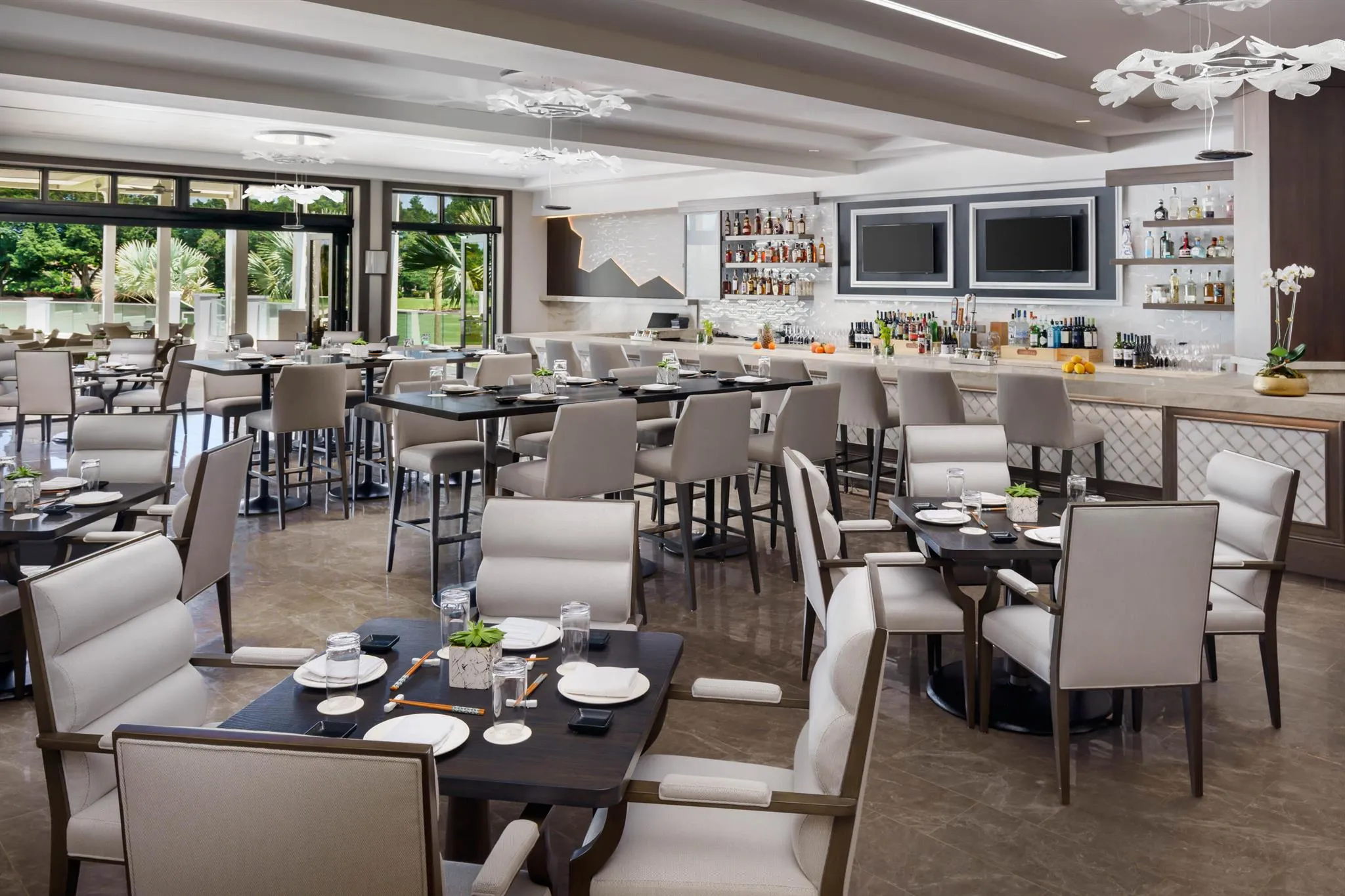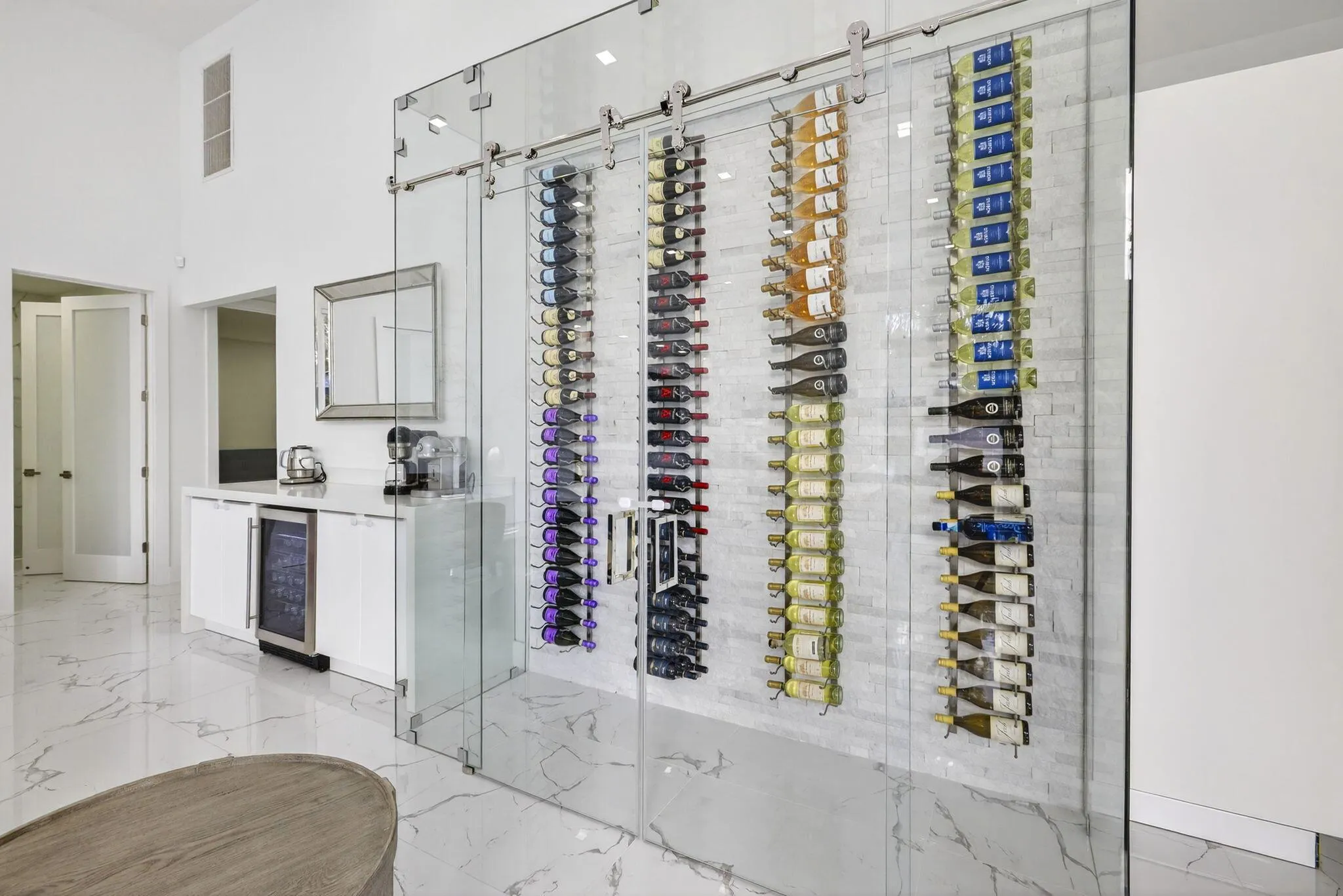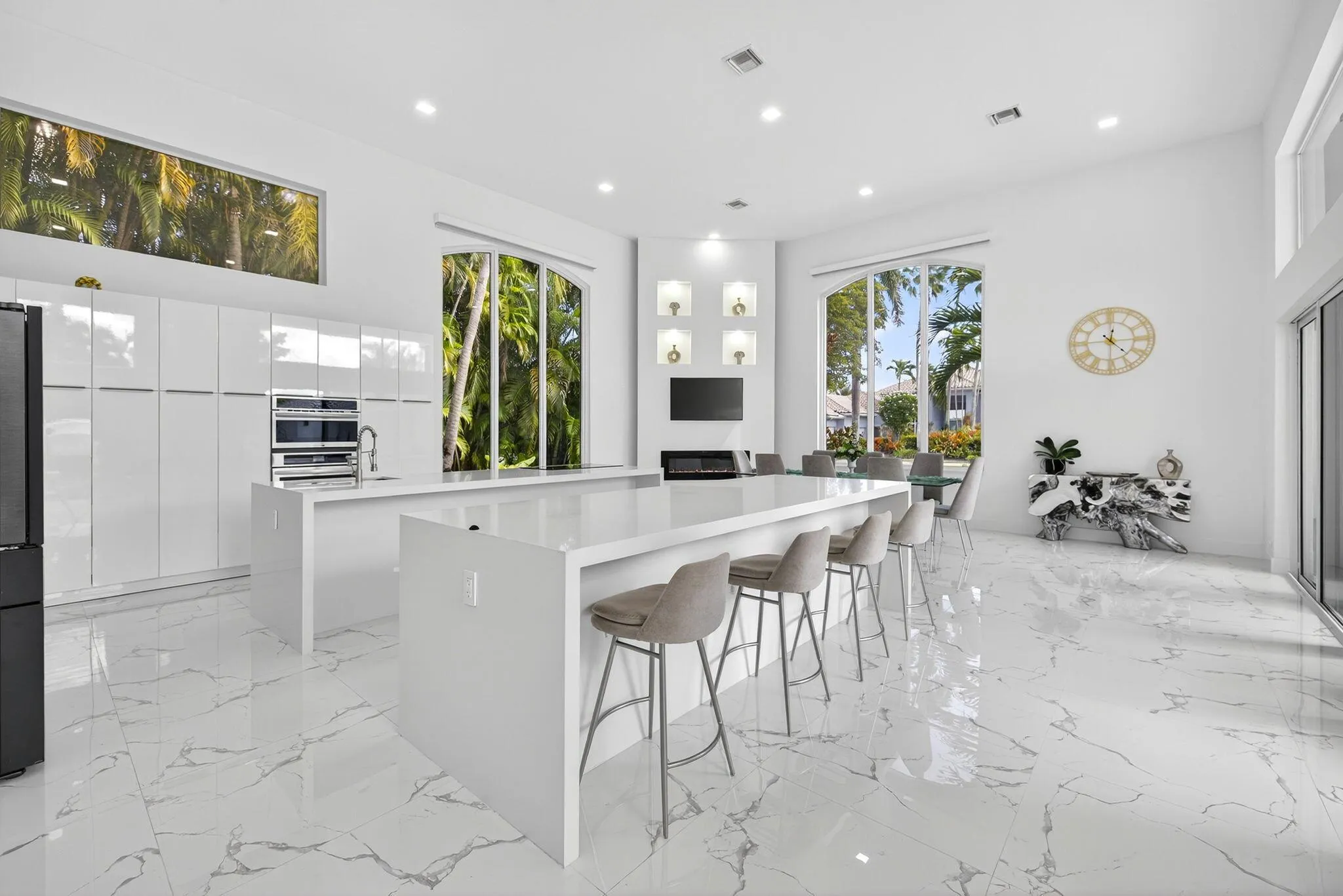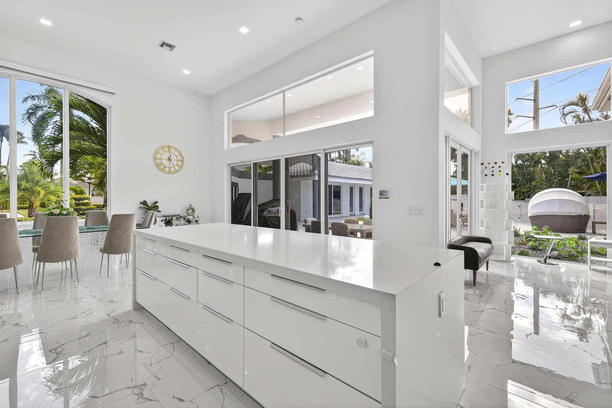 Experience refined luxury living in this spectacular single-story estate home, perfectly situated in the prestigious Village of Grand Oaks within the exclusive Broken Sound Country Club. Recently renovated and meticulously designed, this 6-bedroom, 6-bath courtyard residence offers the ultimate blend of modern elegance, privacy, and resort-style living. Step through the grand entry into an expansive great room with vaulted ceilings, smooth-finish walls, LED lighting, and a dramatic Glass wine display, all overlooking the serene courtyard and private pool. Walls of impact windows and automated blinds seamlessly connect the indoor and outdoor spaces, filling the home with natural light. The chef’s kitchen is a showpiece, featuring double islands, white cabinetry, Quartz countertops,