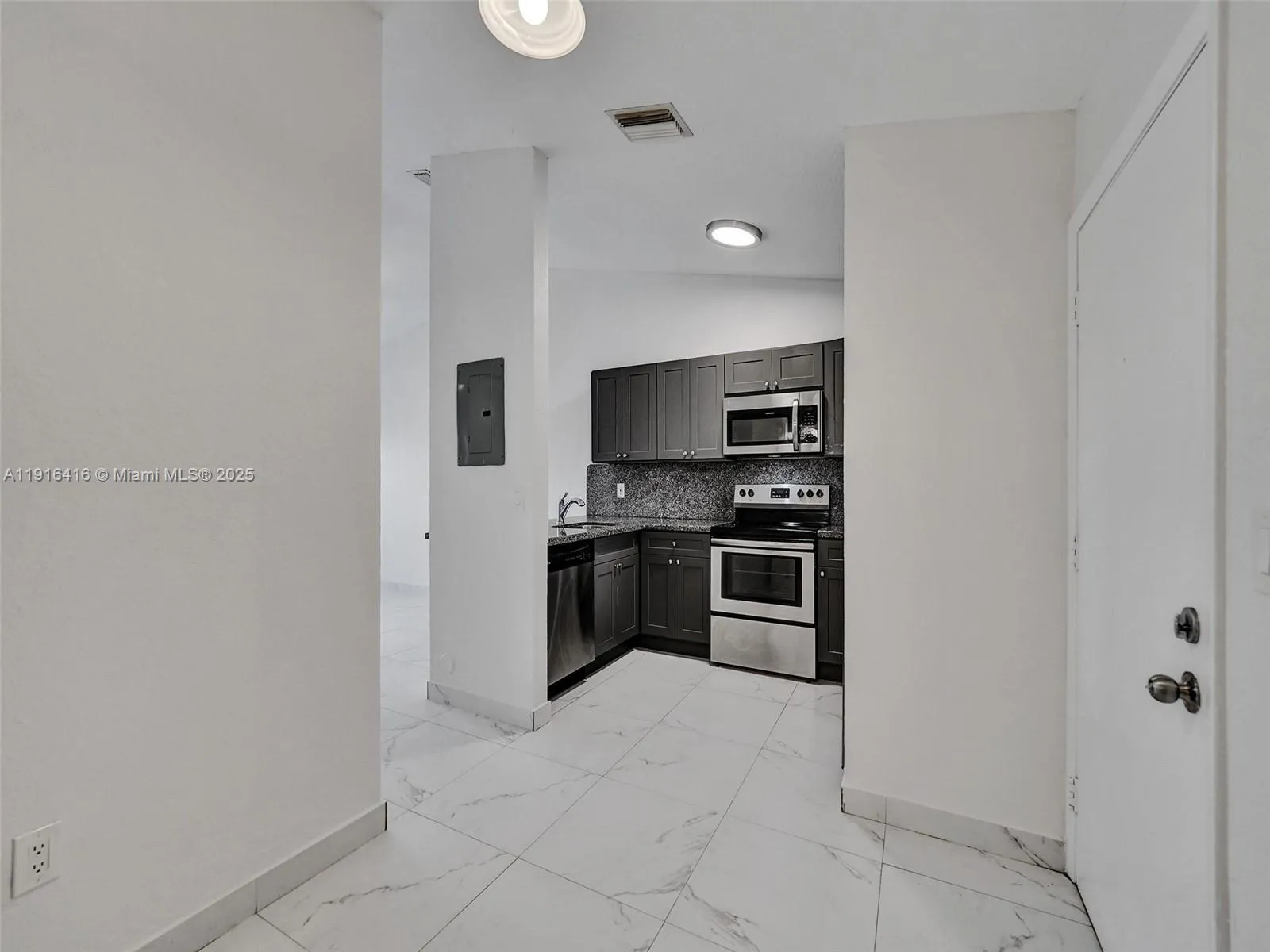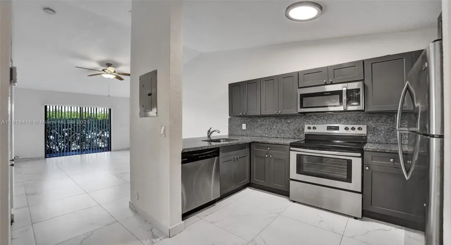 Beautifully renovated Redondo Villas unit in East Hollywood! This 1BR villa-style apartment features new porcelain tile throughout, a modern kitchen with granite countertops, all stainless-steel appliances including a built-in microwave, dishwasher, and the convenience of an in-unit washer/dryer. Enjoy central A/C, a private outdoor patio, and reserved parking. Located next to a private golf course in a serene community with an in-ground pool. A must-see!