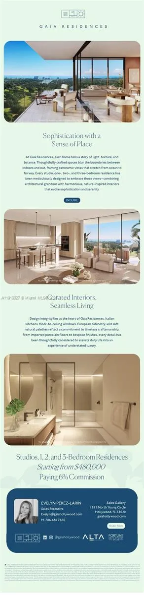 GAIA Residences, Hollywood’s premier luxury condominium. Modern open layout with full kitchen, premium appliances, and elegant bathroom. Enjoy nearly 2 acres of amenities including rooftop pool, fitness center, spa, co-working lounge, 24/7 concierge, valet & EV charging. Owners receive complimentary Golf Club & Beach Club access. Unbeatable location—steps from Downtown Hollywood, Young Circle, restaurants, arts & culture, and just 5 minutes to the beach. Flexible rental program: 30-day minimum, 12x/year. Estimated delivery 2028.