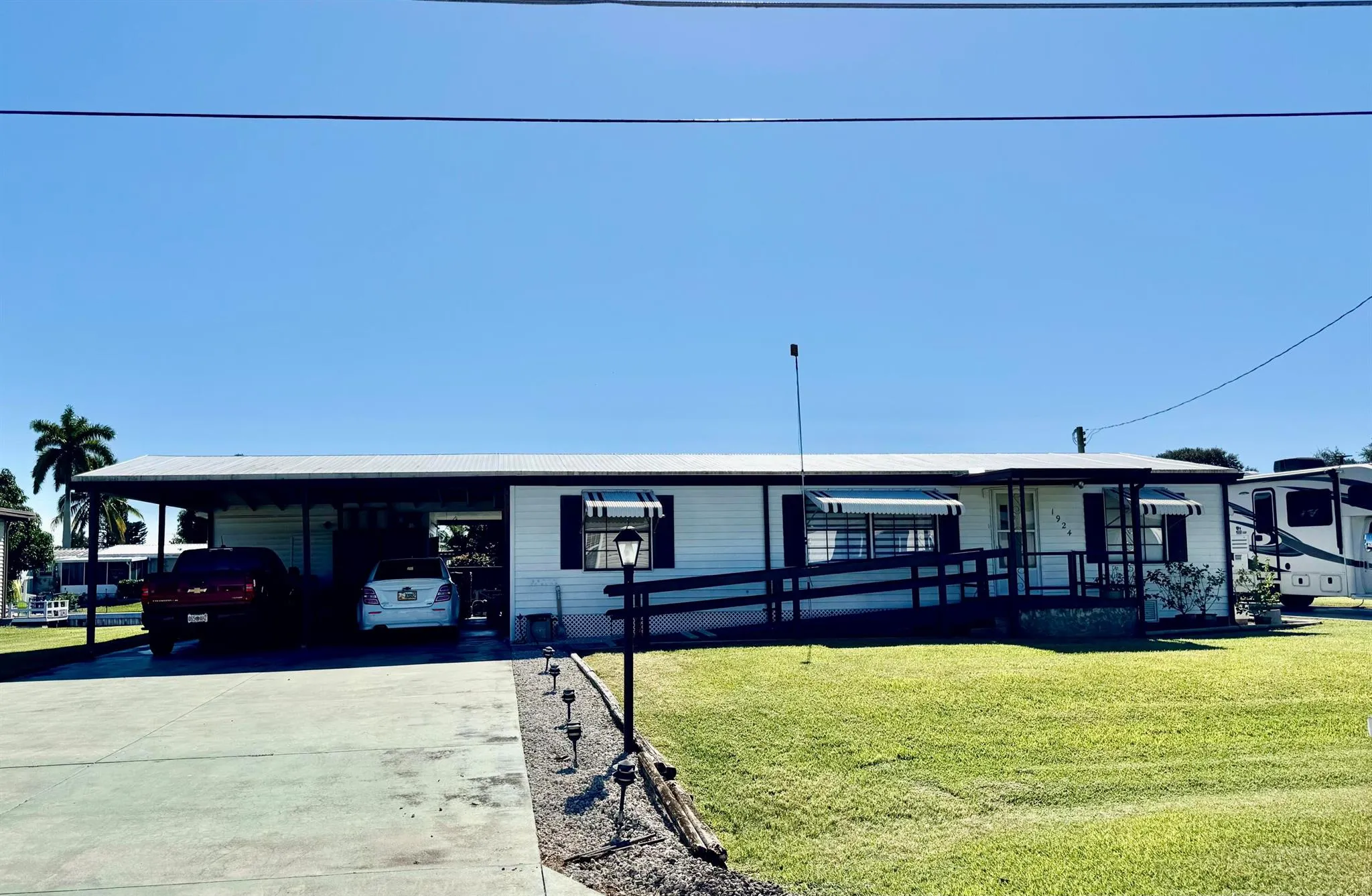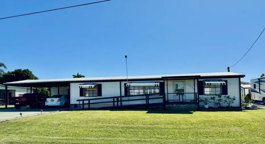 TAYLOR CREEK ISLES~ Lake ”O” access! Beautiful, polished curb appeal! 3 Bd, office (4th Bd/ craft room) 2 Ba – DWMH w/ 12×24 Florida room w/ faux fireplace. Split plan, open concept. New LVP flooring, interior paint and ceiling fans/ lights. Vaulted 22×24 DOUBLE CARPORT, breezeway seating, 16×12 Workshop and shed. Two driveways. 45′ concrete drive for RV with hookup. So many possibilities! Seawall, 12×18 party dock and 12×24 covered boat parking with lift. A HONEY of a FISHERMAN’S DREAM! Dimensions are approximate, must measure for exact.