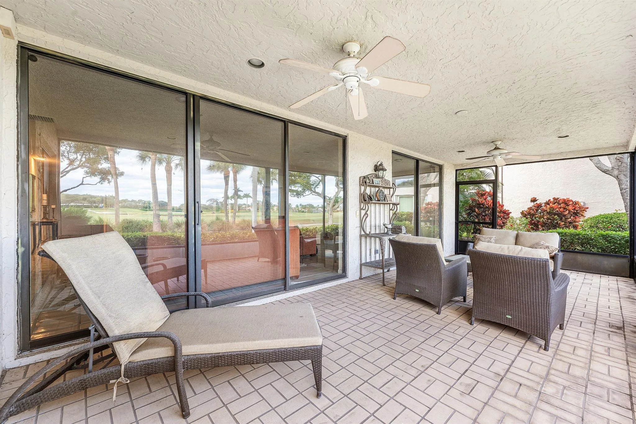 Set in a coveted location in Eastgate at Hunters Run Country Club, boasting panoramic water and golf views, this bright and airy residence offers an expansive 1809sf of living space featuring an updated eat-in kitchen with stainless steel appliances, a spacious living/dining area filled with natural light, and a versatile den that converts to a 3rd bedroom or home office. The primary suite features a king-size bedroom, en-suite bath with separate shower, soaking tub, and multiple closets. Outside, an open-air side patio is perfect for BBQs and alfresco dining, and the screened lanai frames serene vistas that will always impress. Parking is located steps from your front door, and the Eastgate pool and clubhouse are just a short walk away. Club membership is mandatory.