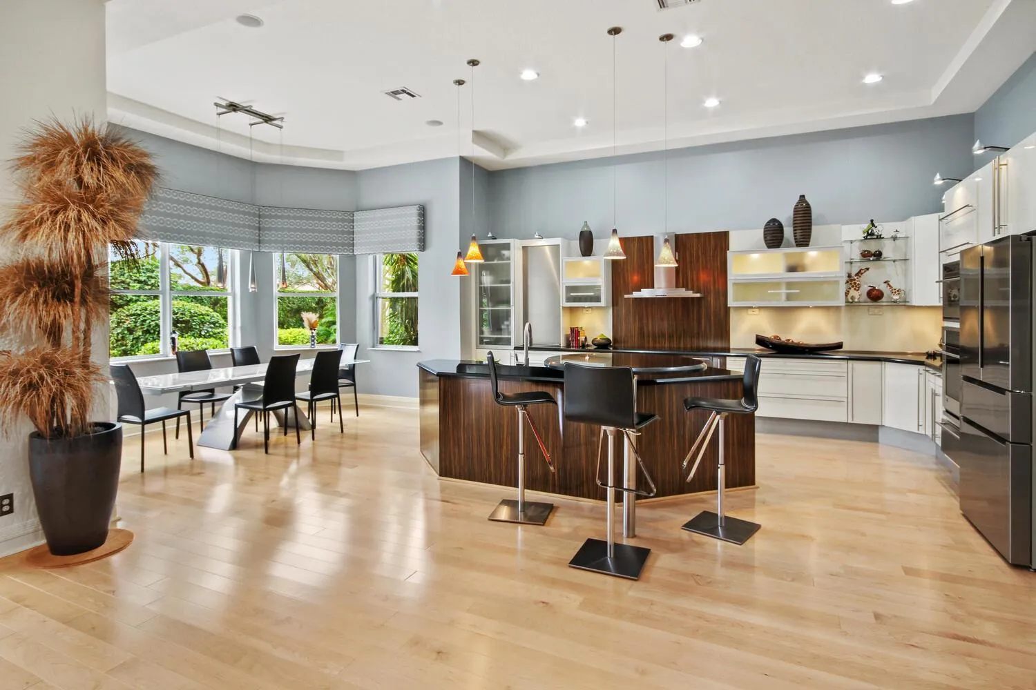 This Riviera model is a 3 bedroom, 2 1/2 bath home, which has been designed and decorated with the most elegant contemporary upgrades. It showcases like any current new community model home at a fraction of the cost. Upon visiting this home, you will see the expansive great room and kitchen open floor plan design, creating elegance and functionality. The new and rich looking hardwood flooring is located throughout most of the home. The primary suite and third bedroom features new plush carpeting. Beautiful wall decor, lighting and window treatments add to the elegance and feel of the home. The exterior patio area has been upgraded with wood ceilings, spacious stone flooring, phantom screening, contemporary fountains and upgraded landscaping with two beautiful canary palm